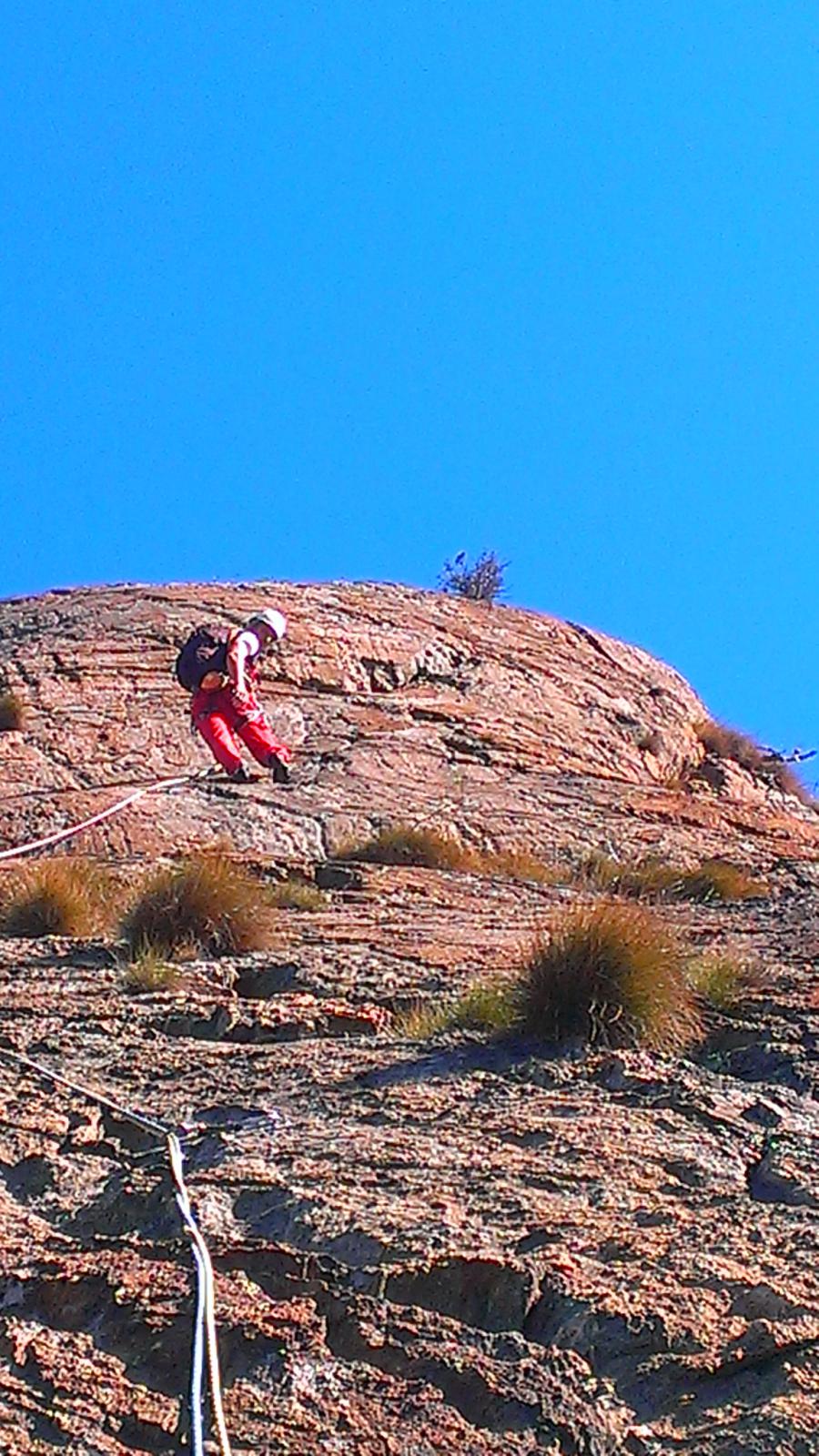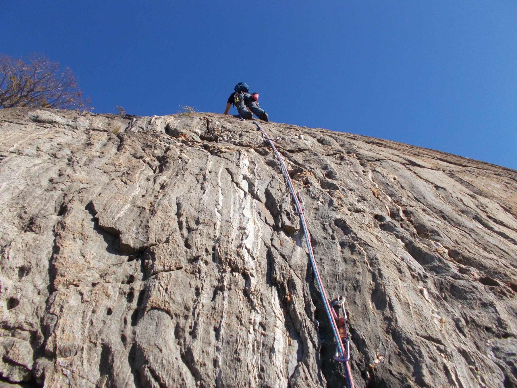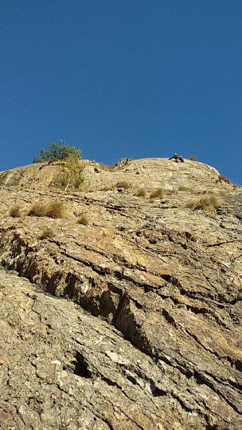 - L4: 5c bel tiro, su fessura in dulfer, verso la fine un passo delicato