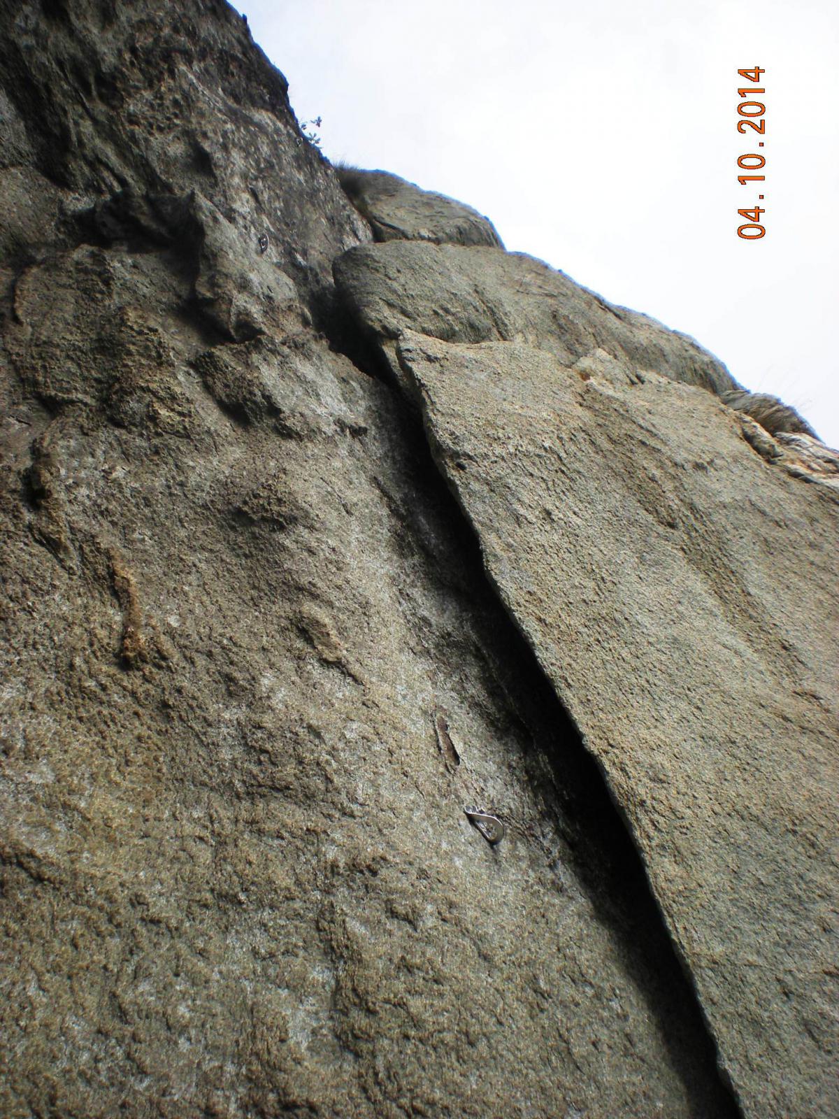 Arrampicata di placca, con una caratteristica fessura nel terzo tiro, completamente attrezzata a fix inox
