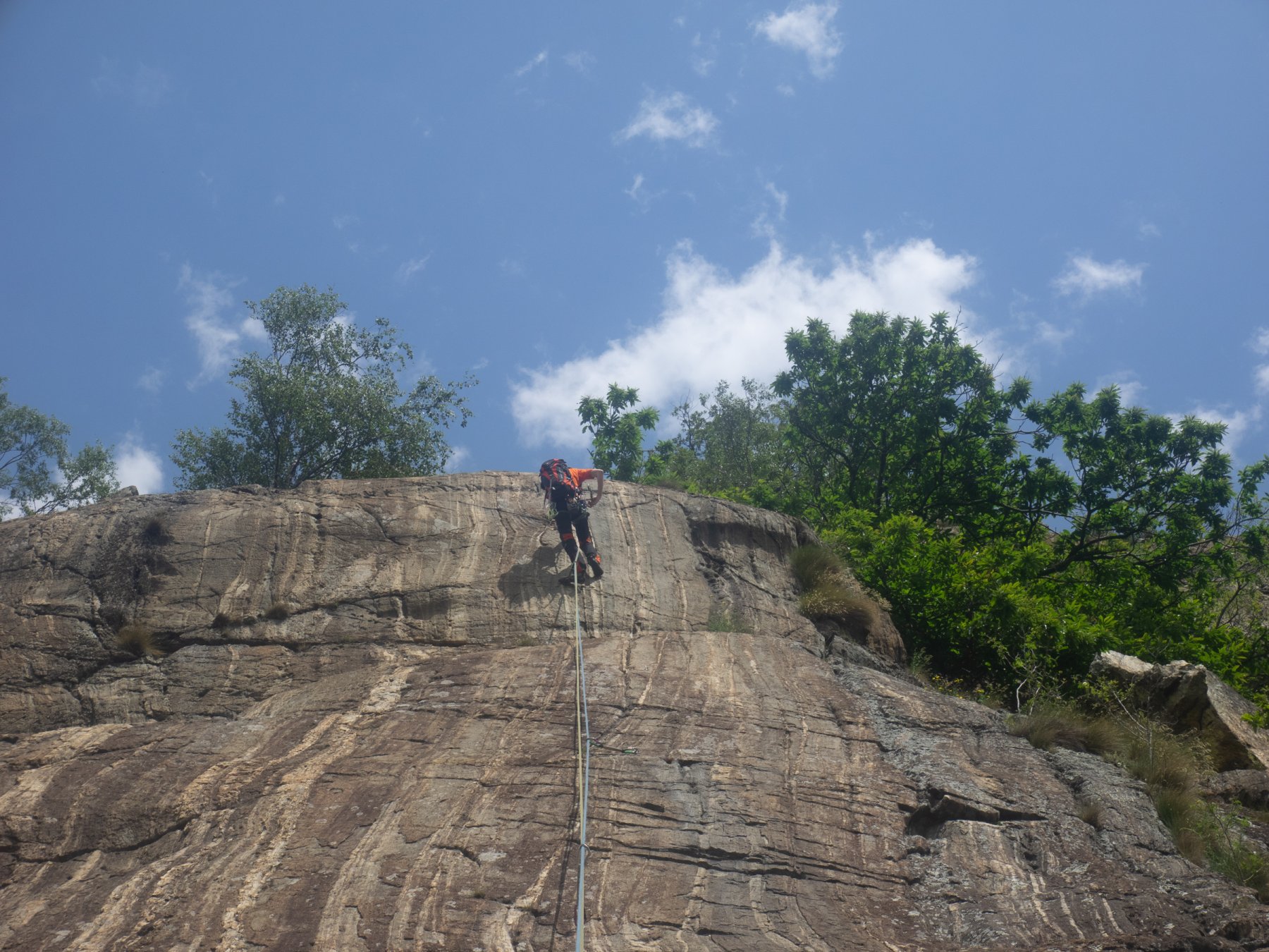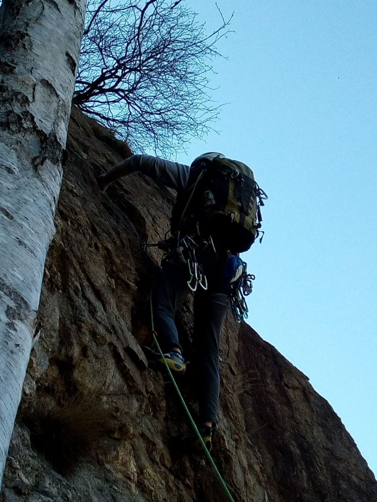 Alcune soste sono su alberi, non continuare quando si trova una comoda cengia con grossi alberi o si rischia di finire la corda, in caso di dubbio meglio fare una sosta in più.