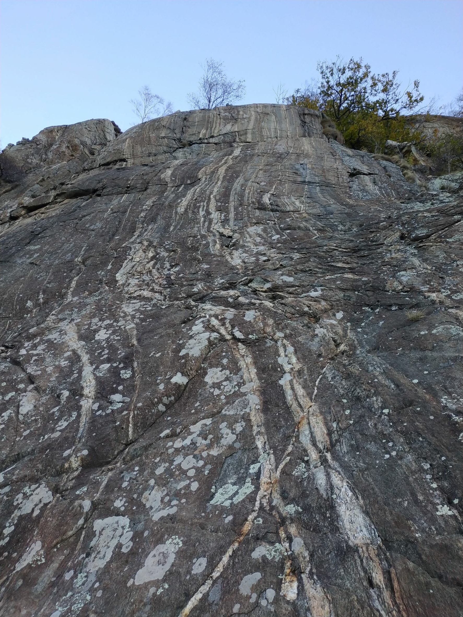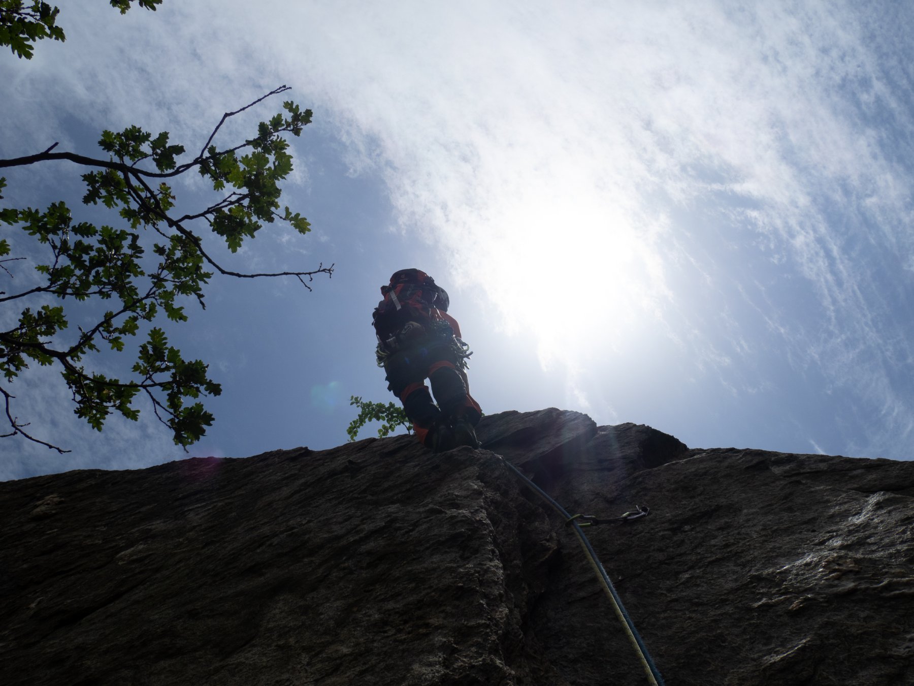 Il tiro di 6a non è facile da individuare: fare sosta sugli alberi alla fine della placca spittata; da qui salire la rampa erbosa sulla dx (II), poi per traverso verso sinistra su roccia ed erba per 20 metri circa seguendo la parete si raggiunge una betulla da cui attacca il muretto di 6a.