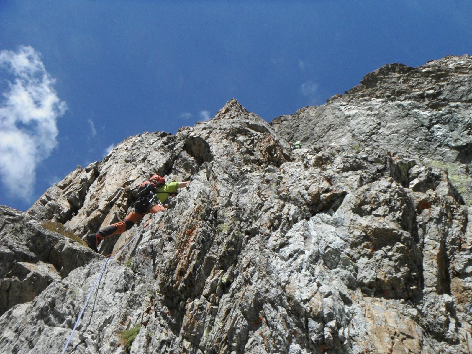 Arrivati sulla cresta, si attacca il muro (IV, 2 spit); si continua sul fianco ovest, poi sul filo fino ad una calata (25 m).