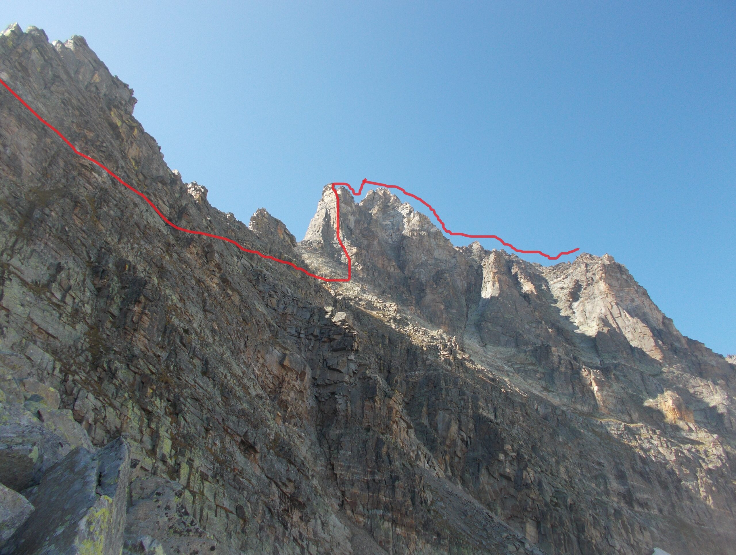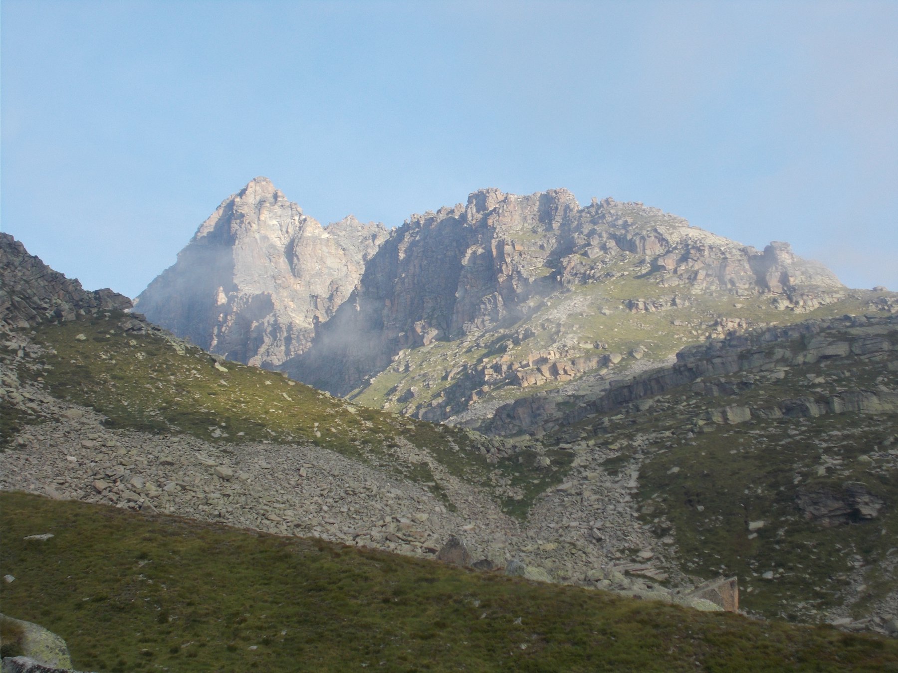 Raggiunta la cresta est portarsi sullo spigolo destro del triangolo con un breve tiro di 4a (ometto alla base dello spigolo). 4-5 ore da Ceresole.