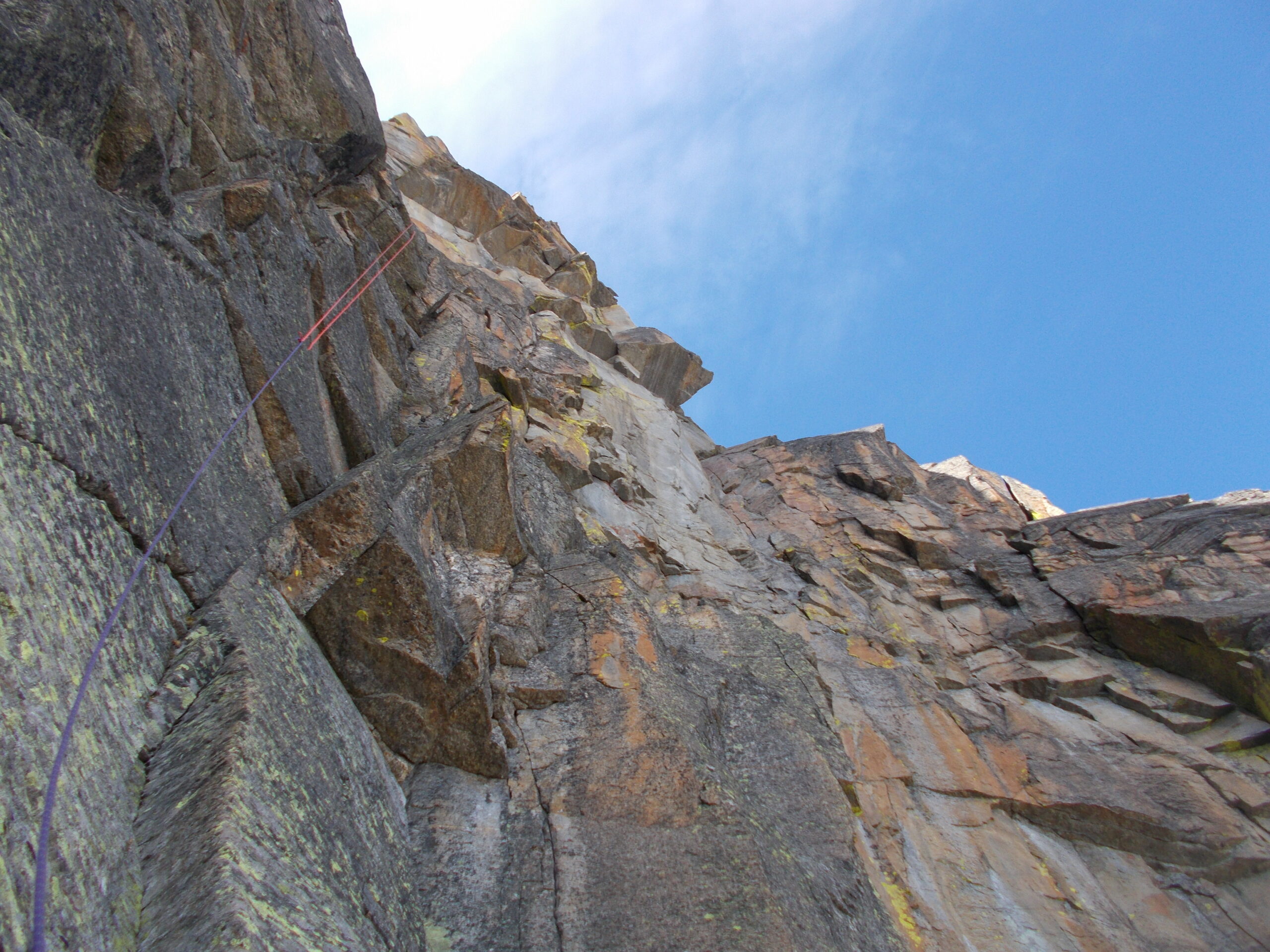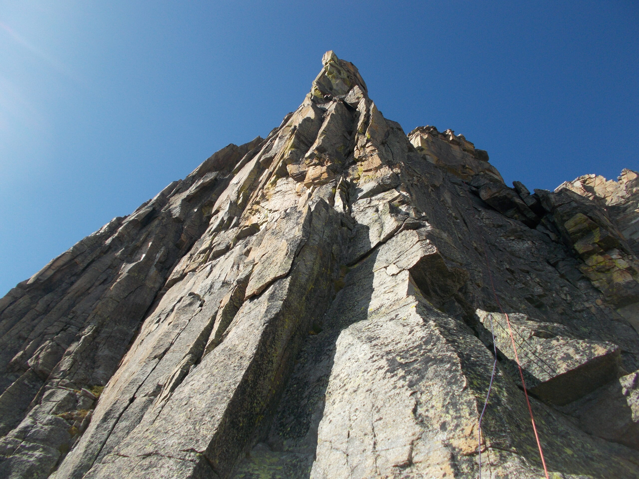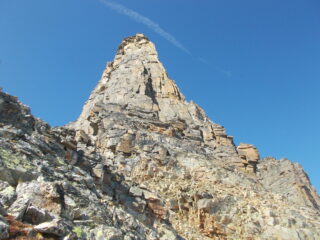 Ora l’arrampicata diviene meno interessante e si può procedere in conserva aggirando verso sud (Ceresole), i monoliti che caratterizzano la cresta. Arrivati in prossimità dell’anticima superare i facili diedri (4b) di roccia non sanissima e giungere su di essa.