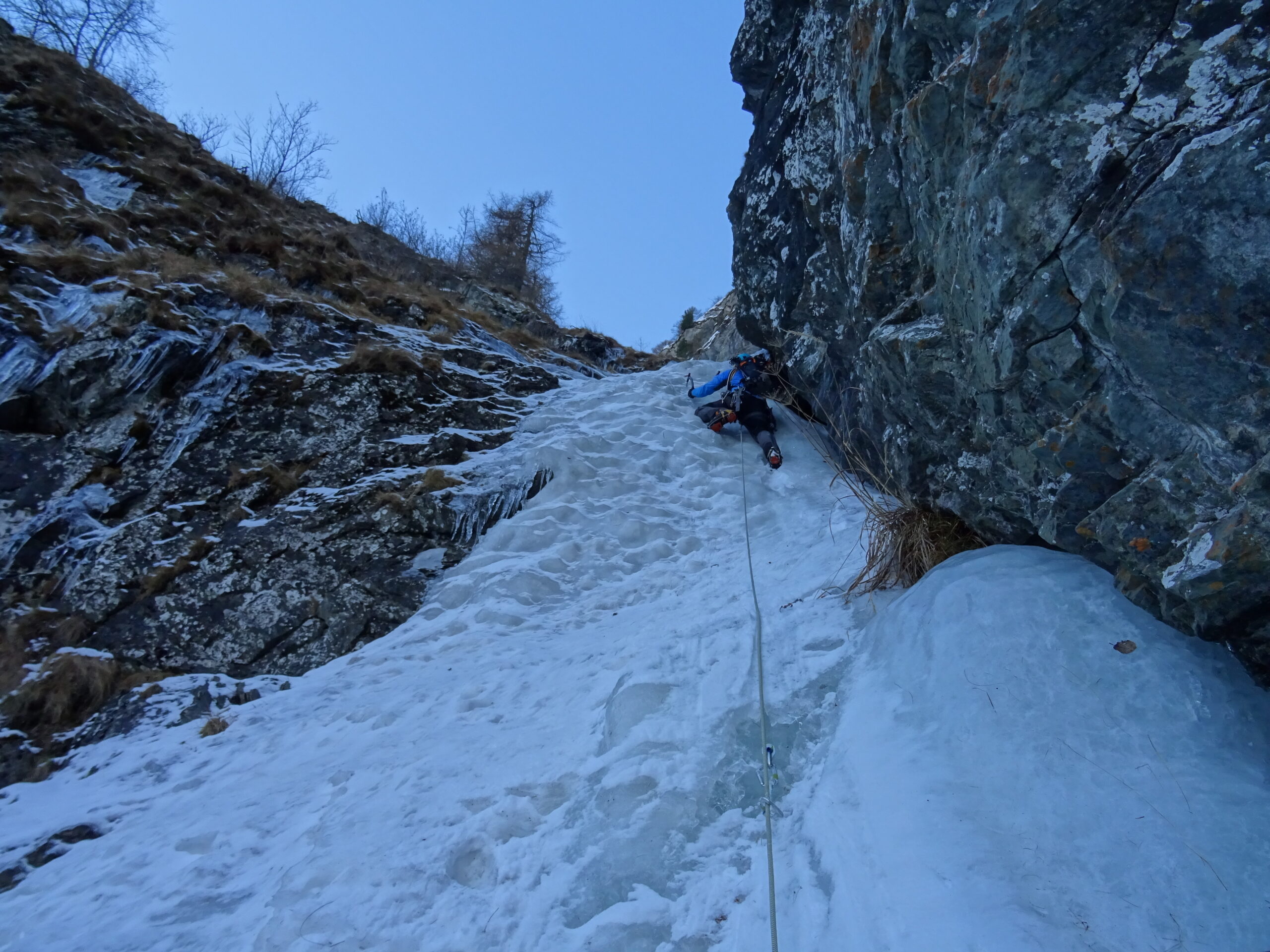 Proseguire ora su ghiaccio meno inclinato e neve ripida, passare una curvatura e quindi affrontare una divertente goulotte in ghiaccio (30m, 60°) che esce sulla dx con un possibile passo di misto. Affrontare un ripido pendio nevoso (55°) e quindi frontalmente un’ultima breve colata di ghiaccio (65°). Passata questa sezione, si esce sul pendio nevoso finale che con pendenze sostenute e un’uscita ripida (55-60°, spesso accenno di cornice) dà accesso alla cresta erbosa fra il Bec di Curnaliot e le Grange del Pis dove termina l’itinerario, con ottima vista sulla conca del Prà e le sue cime.