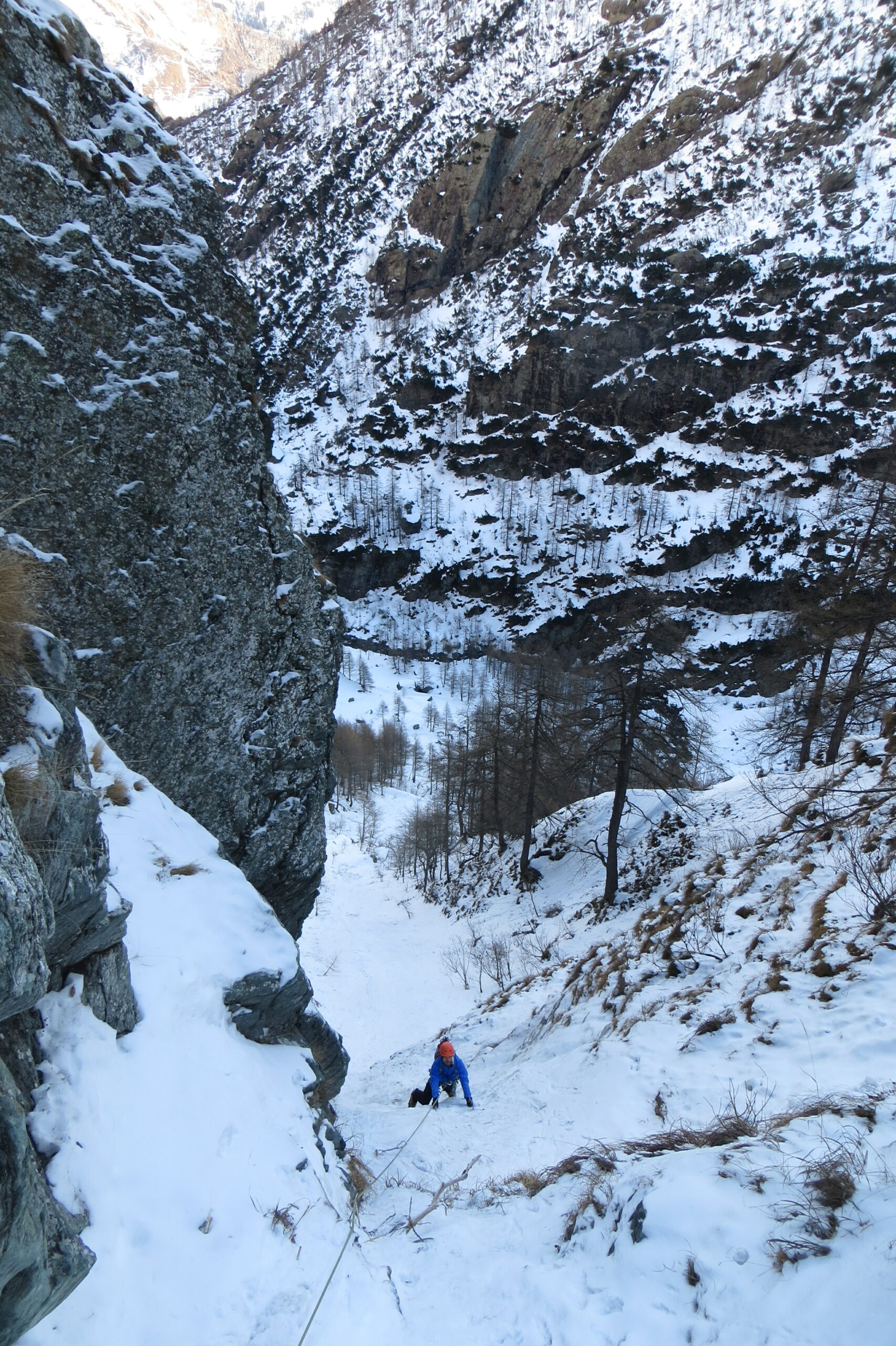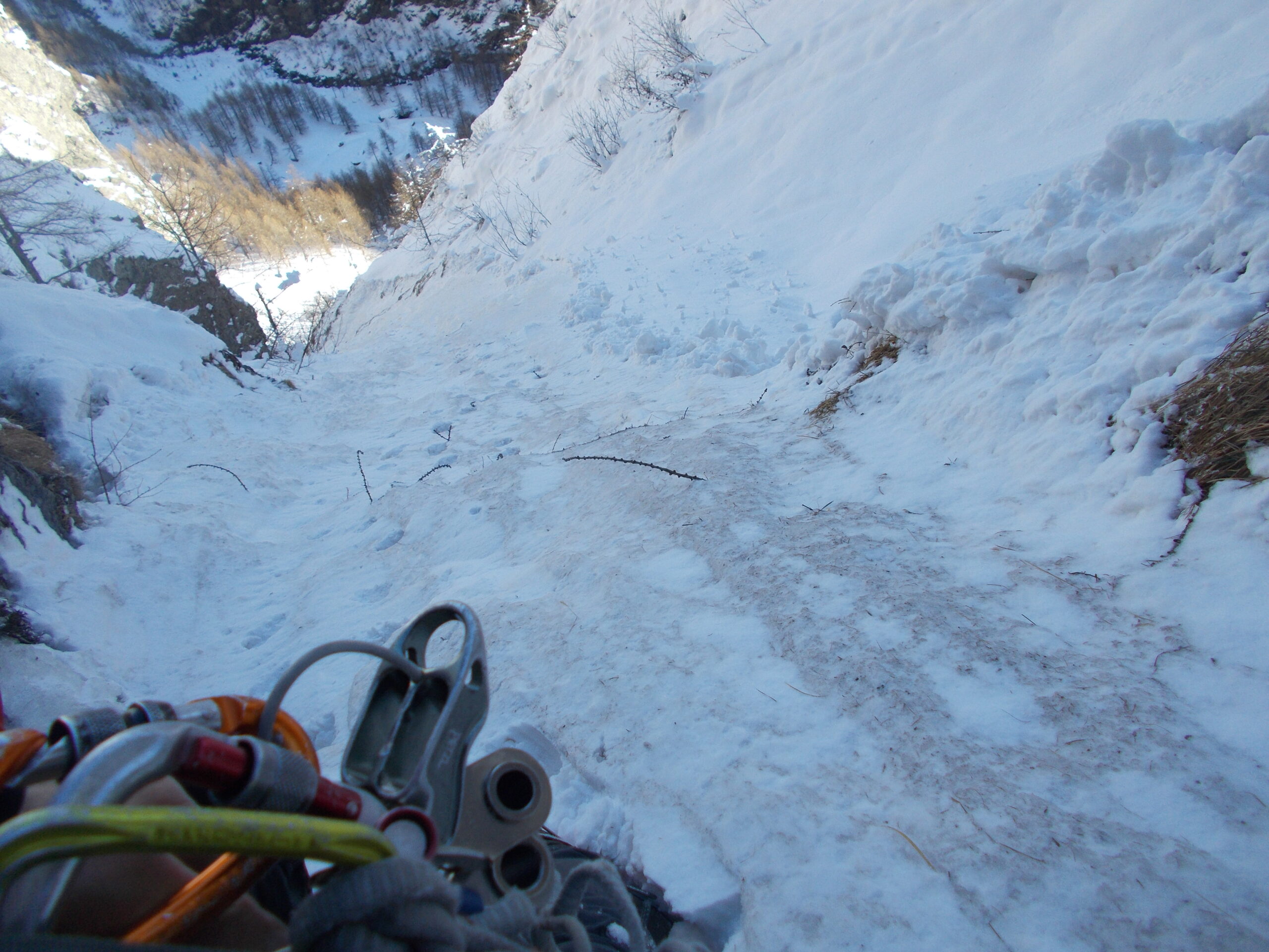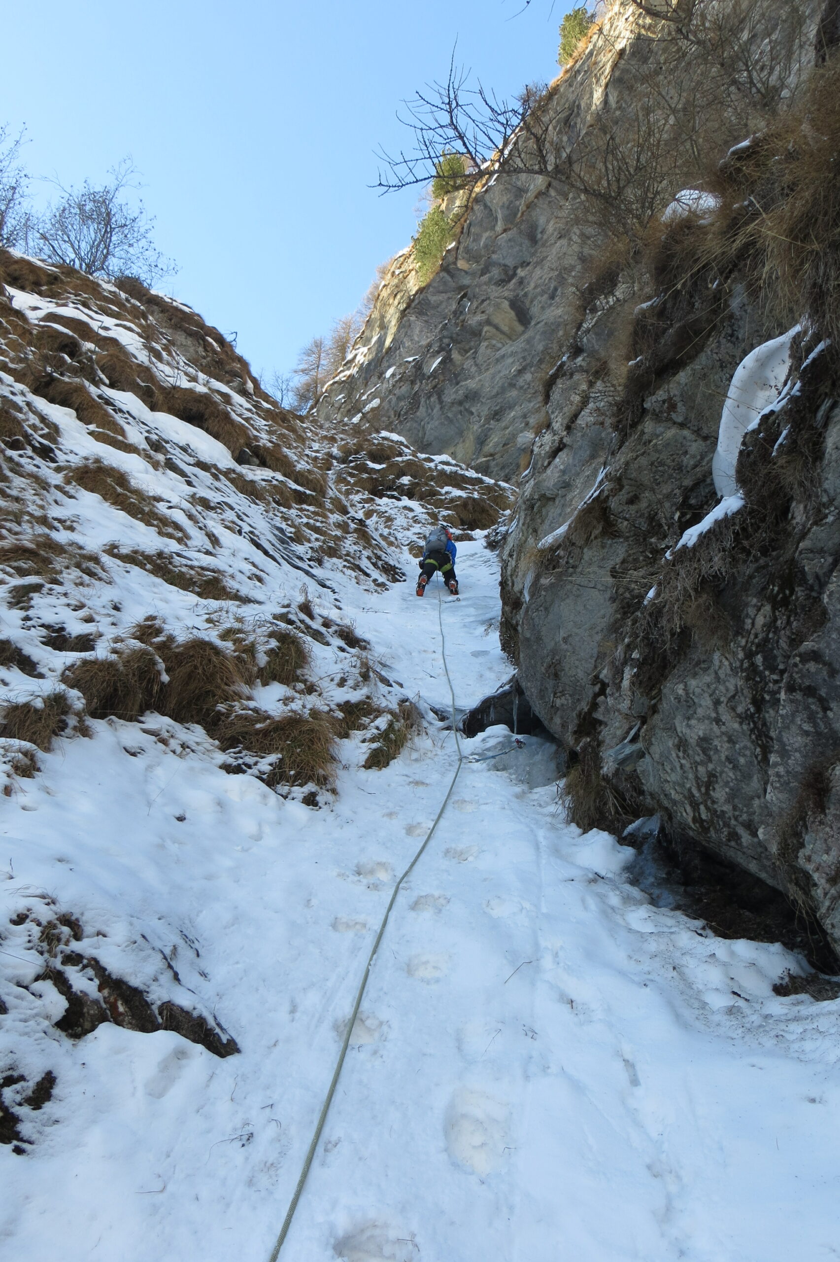 Risalire la colata che presenta un primo risalto ripido (70-75°) e poi prosegue più facile fin sotto ad una strozzatura, al di sopra della quale si sosta (da attrezzare su tronco incastrato se fuori neve, 50m).