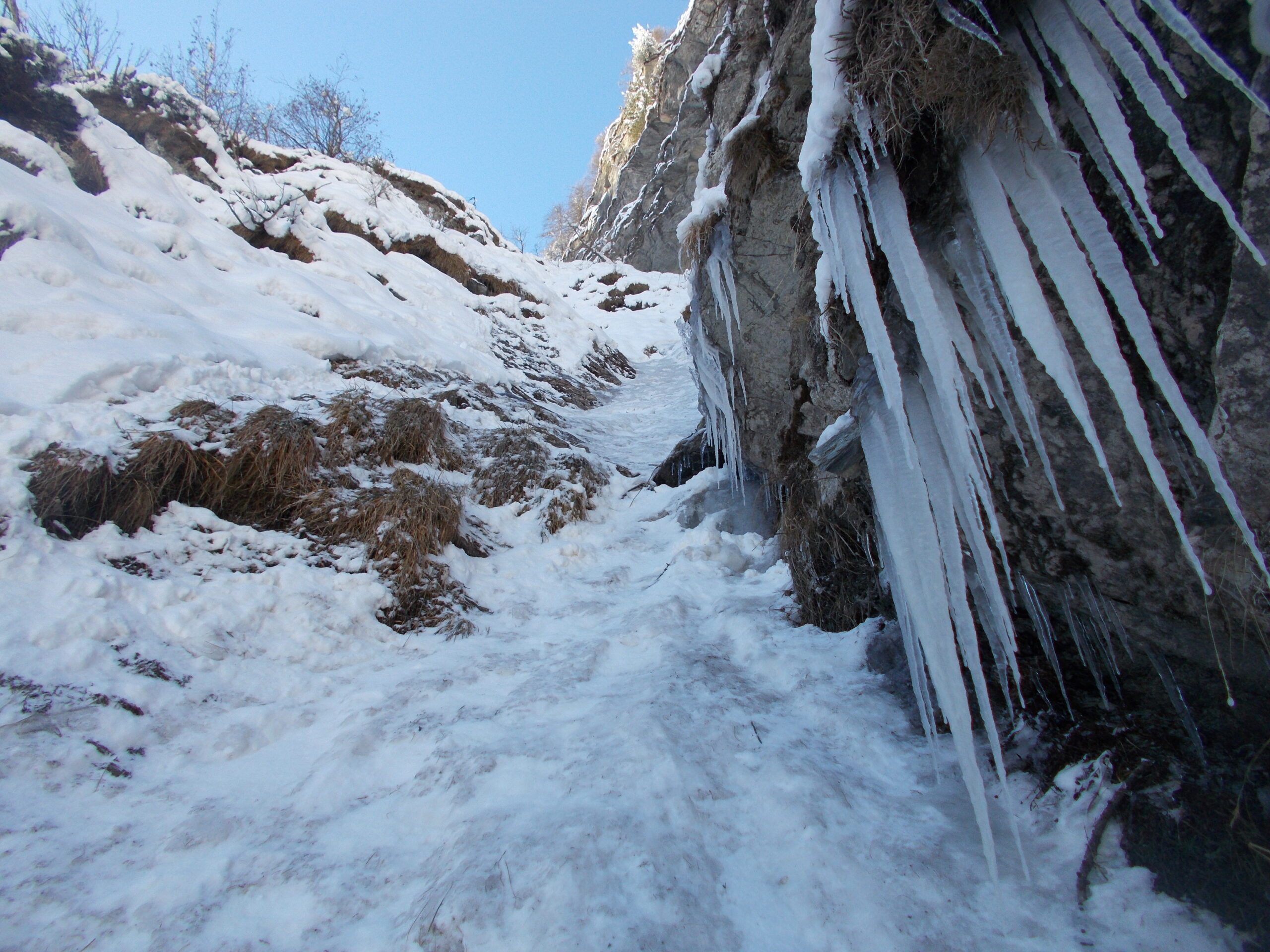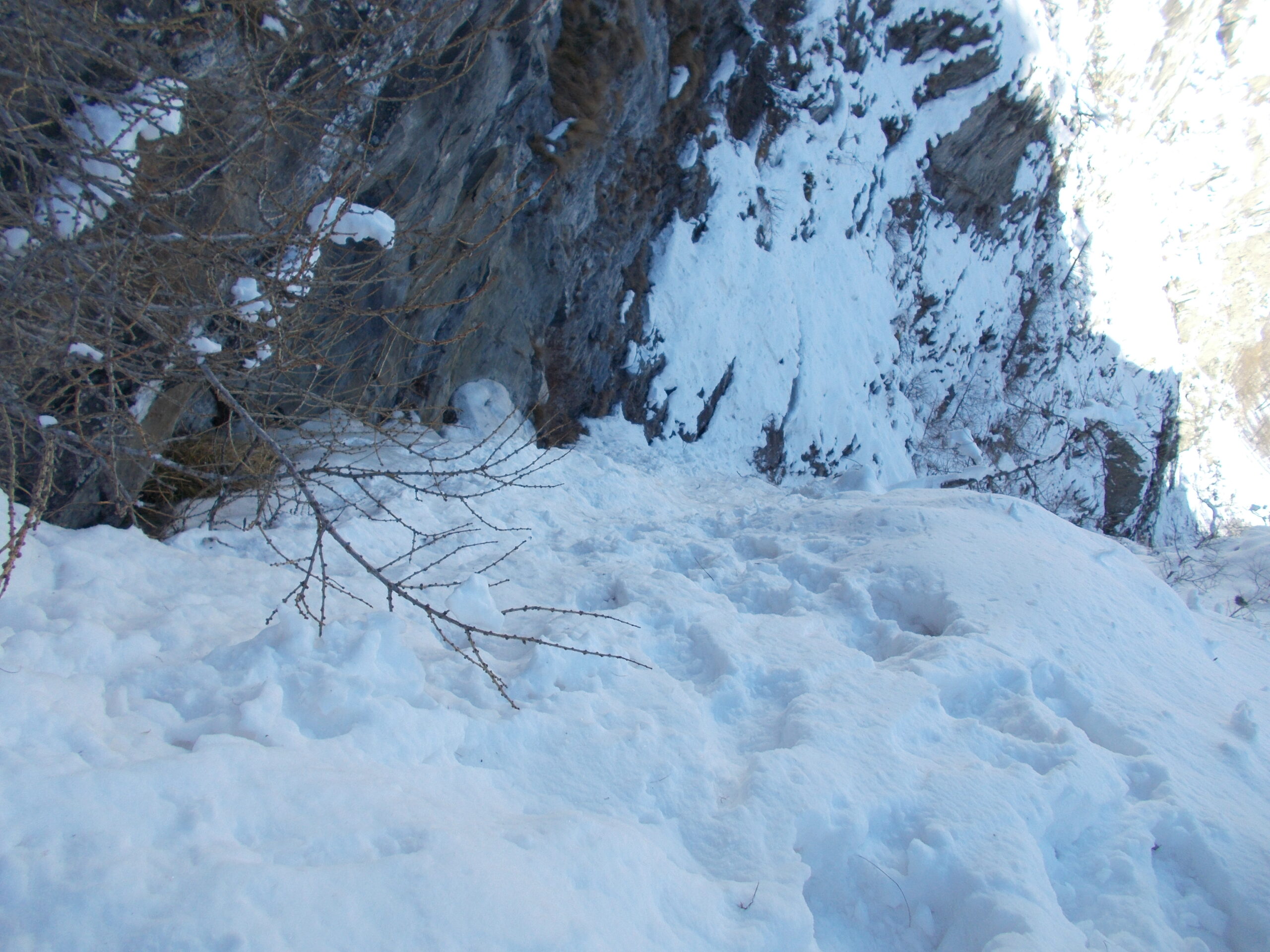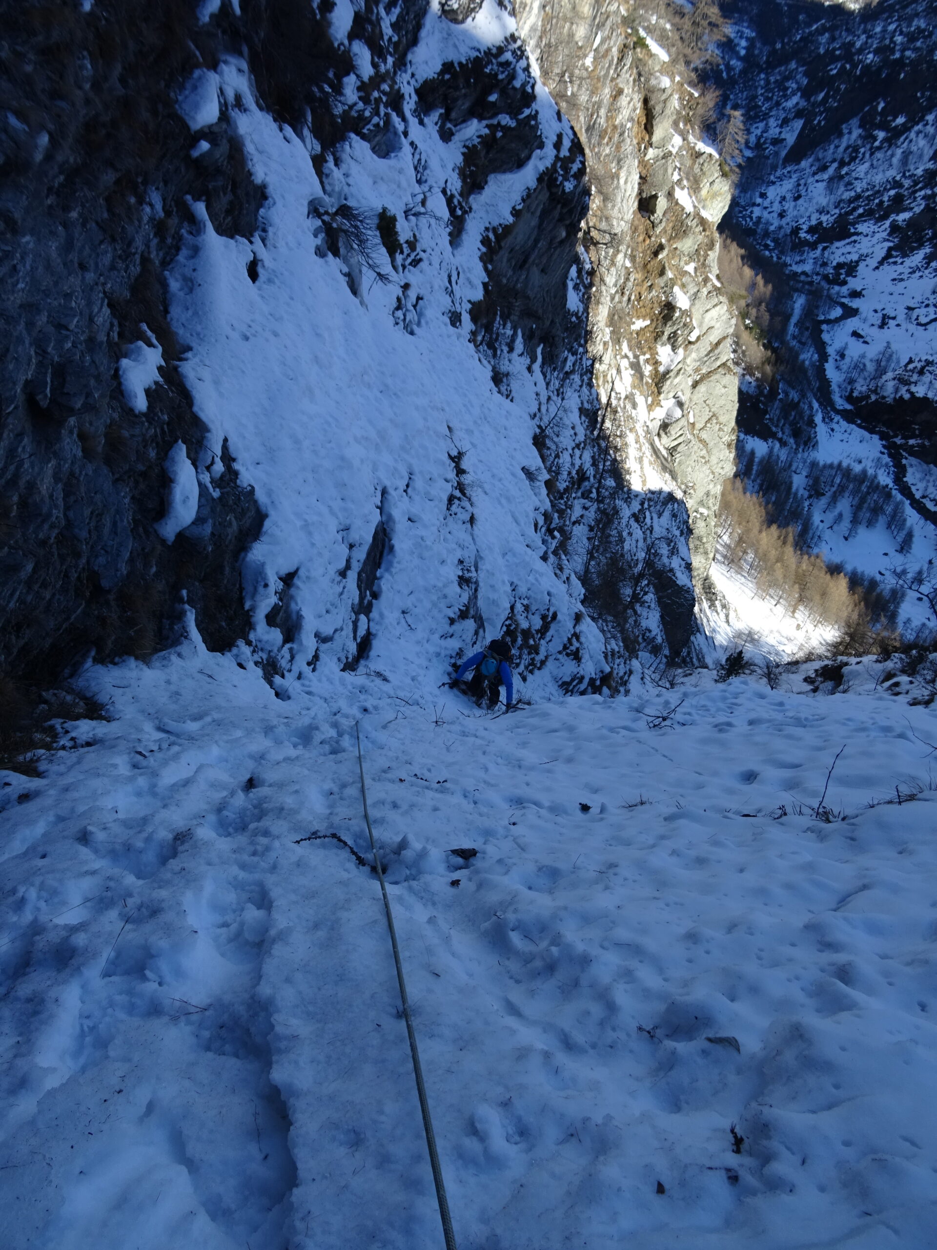 Risalire la colata che presenta un primo risalto ripido (70-75°) e poi prosegue più facile fin sotto ad una strozzatura, al di sopra della quale si sosta (da attrezzare su tronco incastrato se fuori neve, 50m).