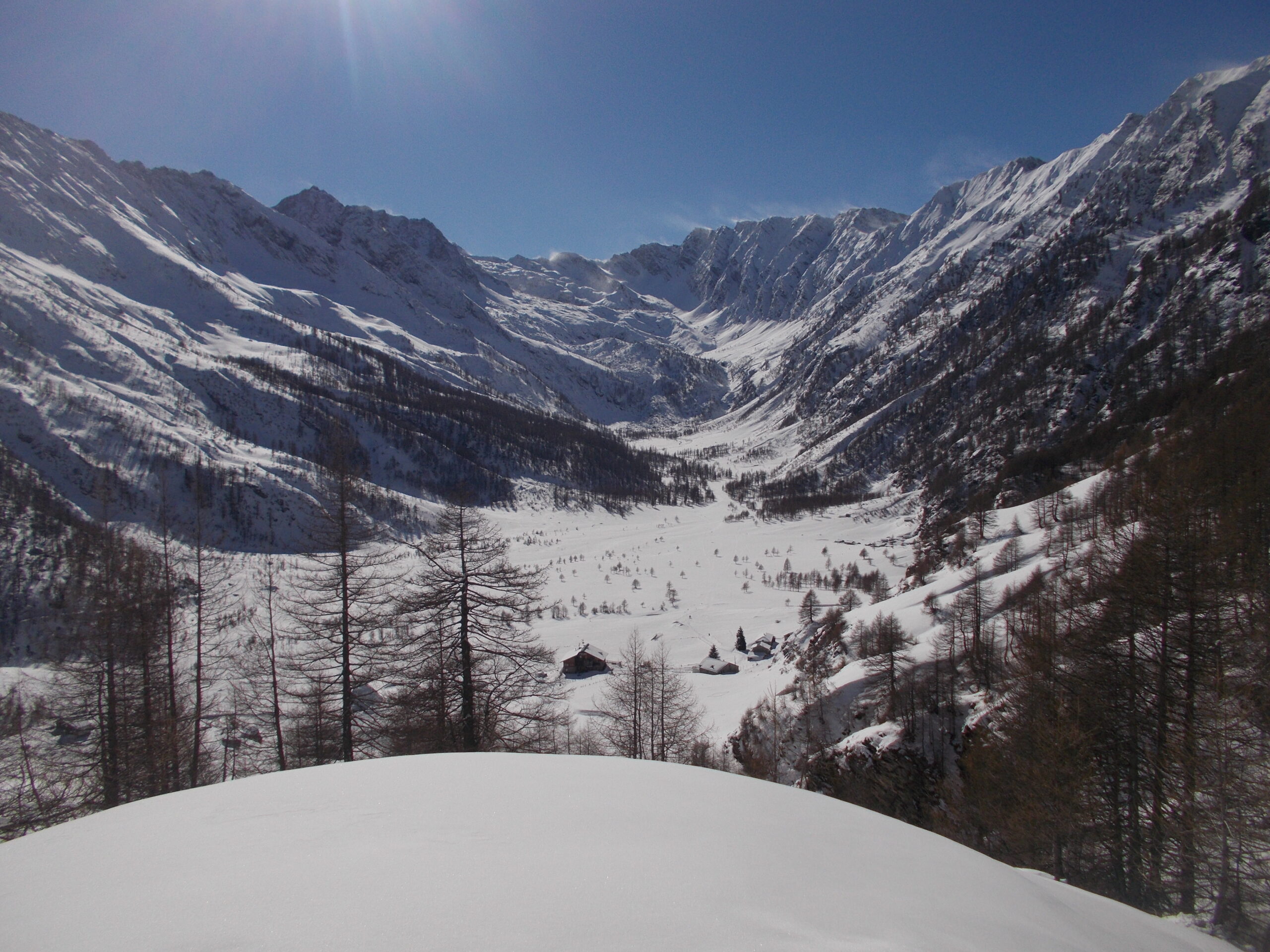 Discesa: scendere a vista i prati esposti a S a monte del rifugio Jervis, quindi prima di raggiungerlo prendere a sx il sentiero che raggiunge la pista a valle del ponte sul torrente.