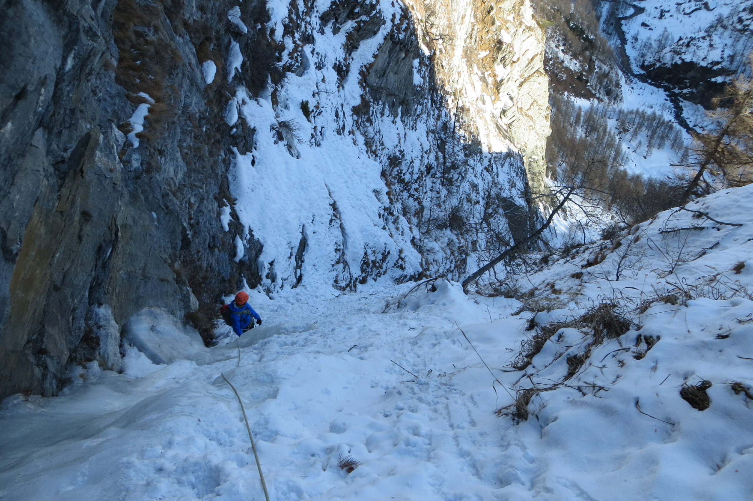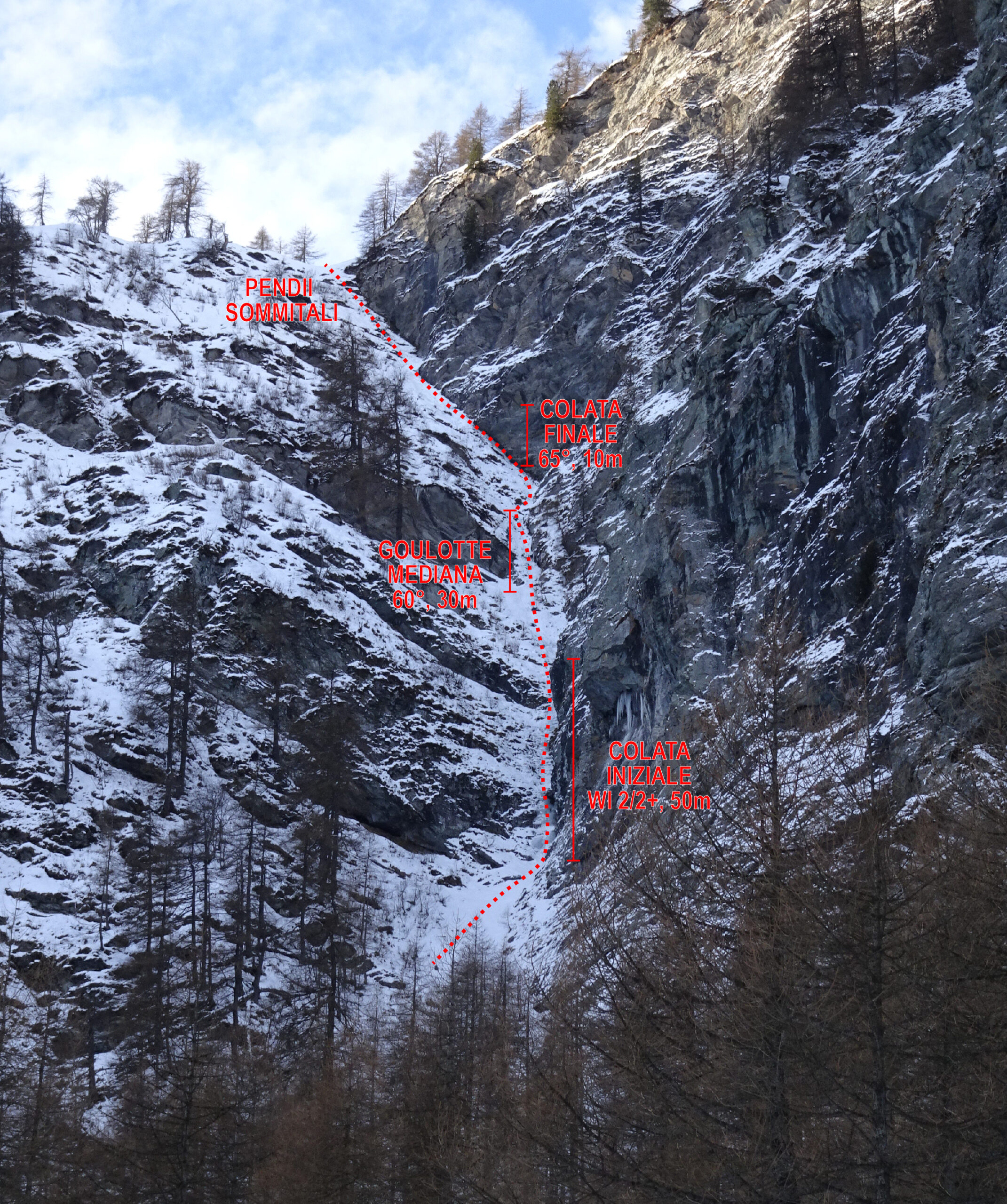Itinerario di alpinismo d'antan costituito da 3 porzioni: una cascata di ghiaccio iniziale, una parte di misto e goulotte ghiacciate mediana e una parte finale su ripidi pendii nevosi.