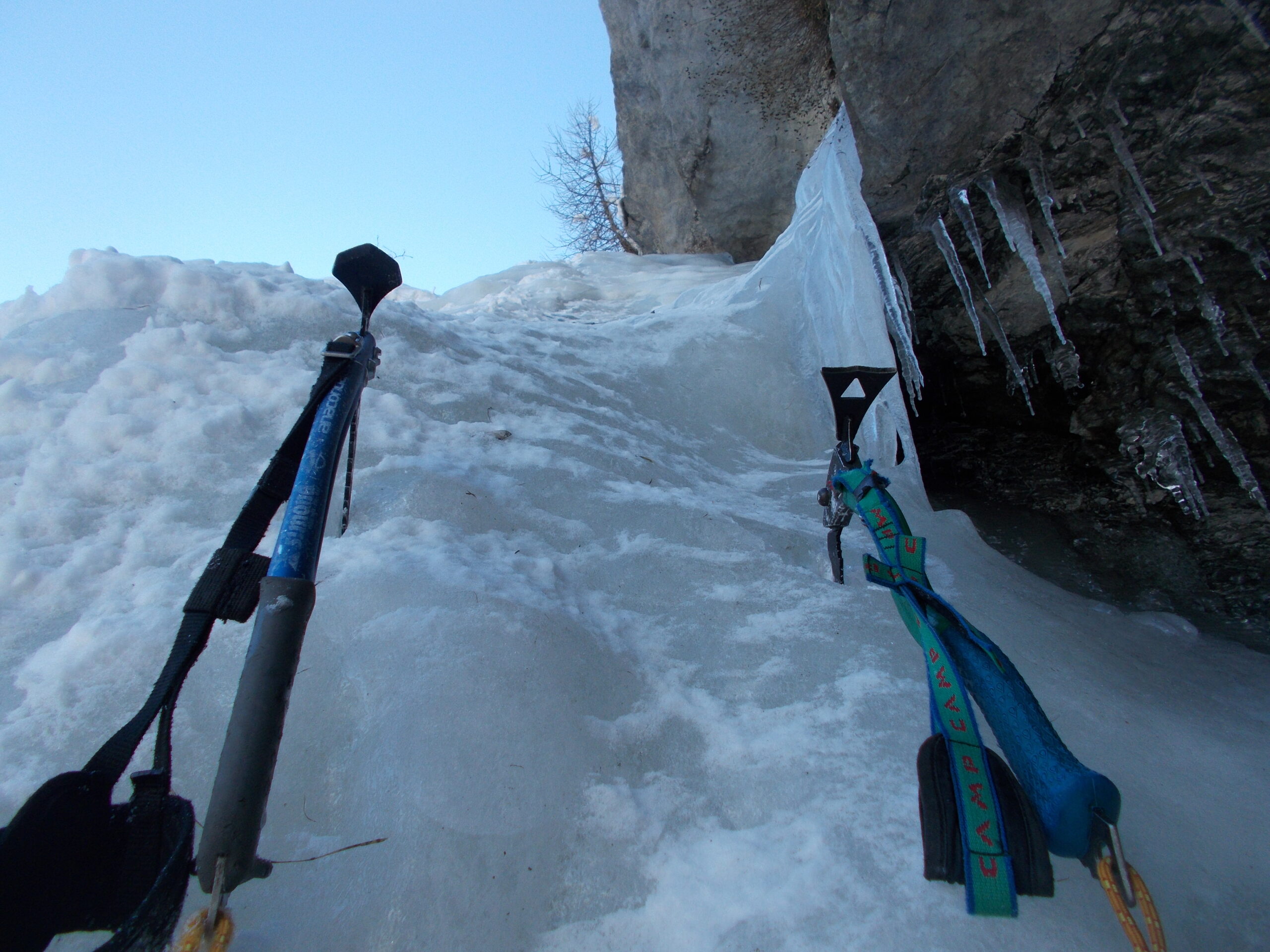 Sia il sentiero gia’ alla partenza come la pista del gatto arrivare all’attacco, un unico nastro ghiacciato. Vento forte da subito ma che si attenuera’ nel couloir essendo riparato. Primo salto praticamente il piu’ impegnativo di tutta l’intera linea, da alzare le antenne anche se breve il salirlo da slegato, per ghiaccio spaccoso affatto facile da gestire. Nel frattempo aveva scaricato l’ultimo deposito di ieri, una decina di centimetri prima del rigelo di questa notte. Quindi ghiaccio scoperto spugnoso gia’ dal conoide iniziale. Un po meglio la stretta goulottina centrale in quanto sensibilmente piu’ abbattuta. Ma il ghiaccio e’ rimasto tale. Parecchie le battute prima di avere poi la certezza che gli attrezzi tenessero.