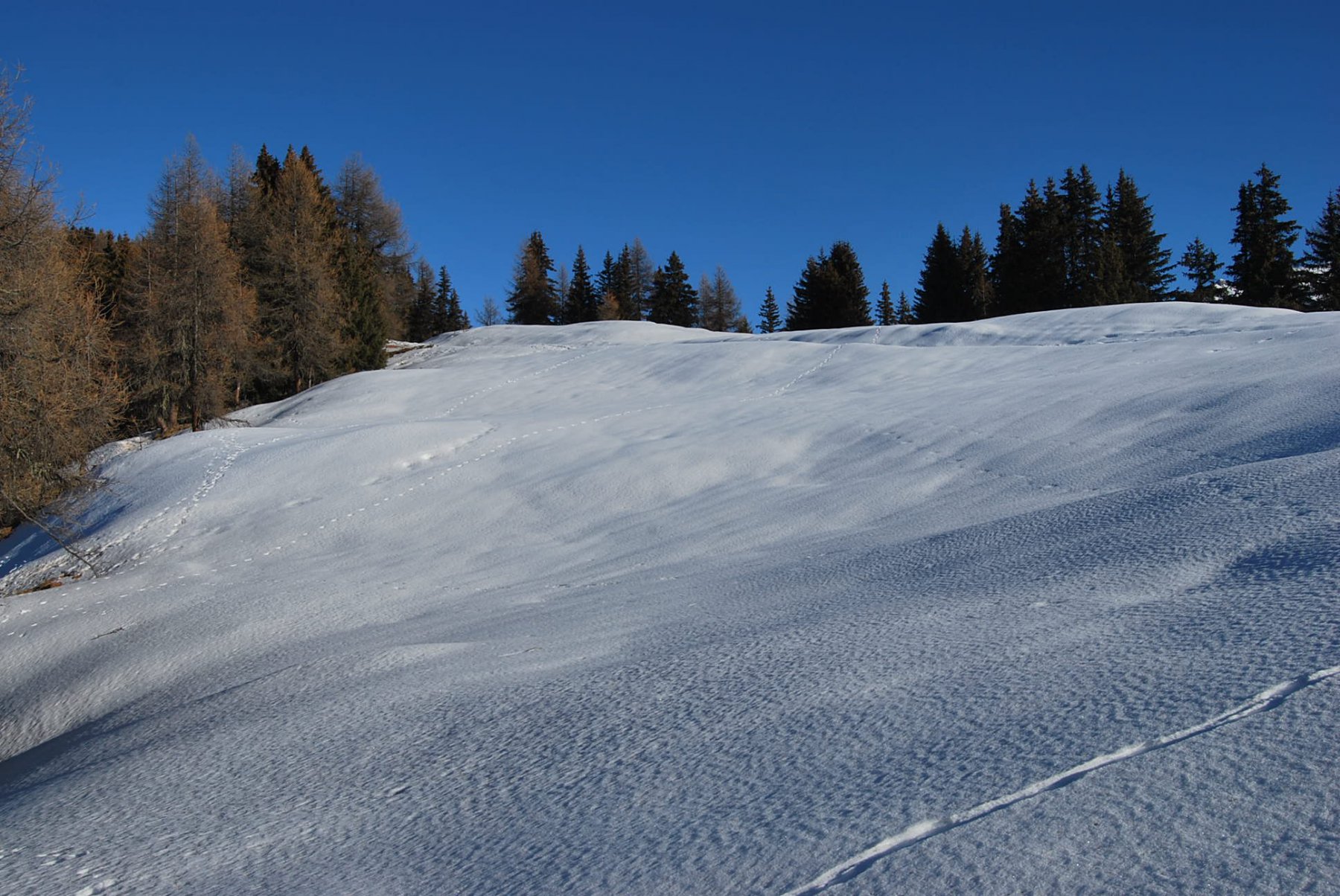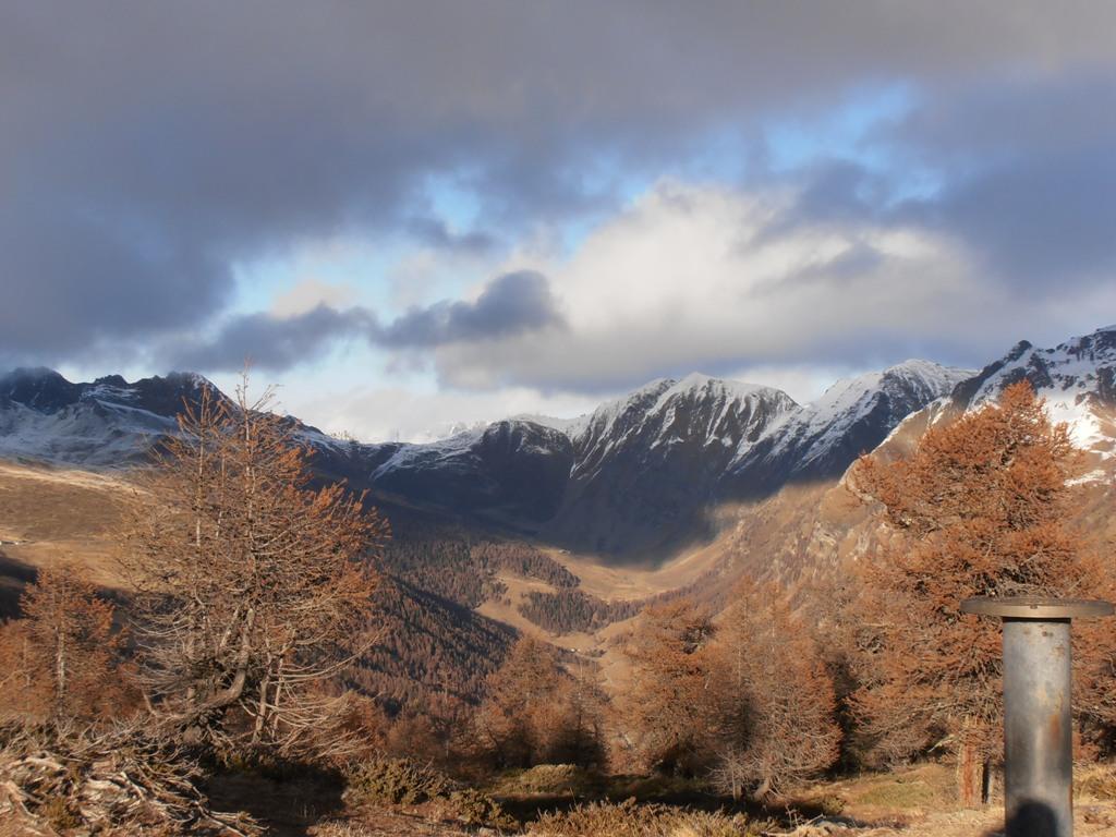 Diventata sterrata, in corrispondenza del terzo tornante, prendere un’evidente sentiero sulla dx che sale nel bosco raggiungendo le baite di Arpilles.