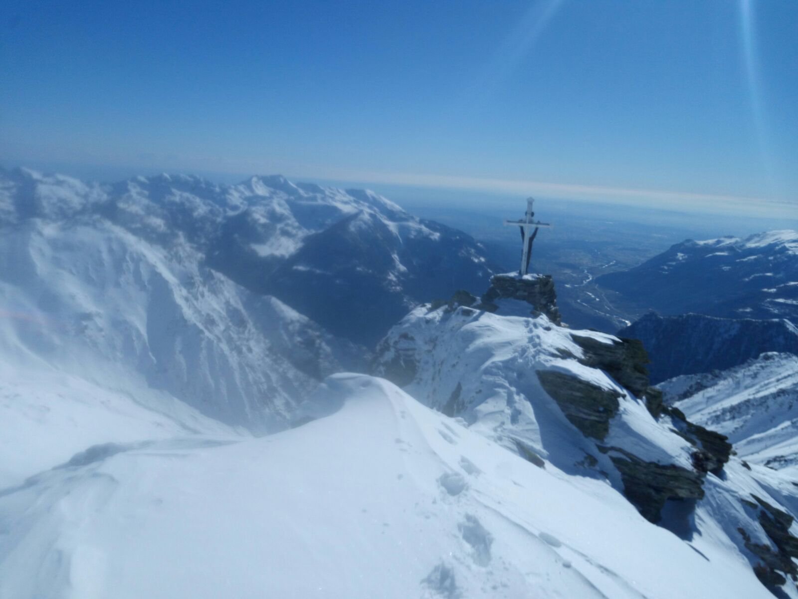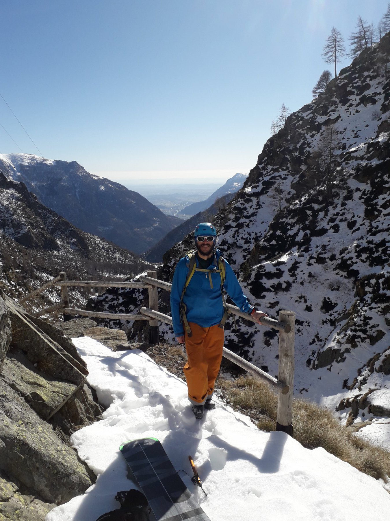 Se la gita cominciasse alle baite Pian (1784 m) sarebbe certamente una delle più frequentate. Invece parte da Fey Dessus (1120 m), la strada è chiusa da una sbarra ma fortunatamente innevata e arriva con qualche gava-buta a Chichalin (1362 m). Da qui parte una bellissima mulattiera che si inoltra nella gorgia de Nantey, attraversandola verso la fine e salendo fino alle sopraccitate baite Pian. Da qui abbiamo montato i rampant e siamo saliti a dx verso la cresta, praticamente seguendo il sentiero estivo. Poco prima di raggiungerla abbiamo cominciato a traversare verso la cima ma calzando i ramponi. Abbiamo lasciato gli sci poco sotto la croce di vetta raggiungendo poi la vera cima poco più a Nord. Anche partendo alle 12:30 la neve è rimasta quasi marmorea, costringendoci ad una grande concentrazione. Siamo scesi direttamente dalla cima verso le baite Barmet, ma ci sono diverse possibilità di scelta. Dalle baite due bellissimi canali paralleli portano alle baite Pian. Da qui siamo riusciti ancora a scendere fino a quando comincia il sentiero transennato. Il rientro con la mulattiera è stato decisamente piacevole come quello sulla strada innevata, questa volta con gli sci. Personalmente la valuto come OS, sia per la pendenza, sia per l’esposizione. Oggi condizioni ottimali: innevamento sulla strada, freddo (anche troppo) e rischio valanghe 1. Consigliabilissima se si mantengono queste condizioni, ricordando che il portage è notevole. Con Francesco (splitboard) che finalmente è riuscito a farla dopo averla vista per anni dal suo ufficio.