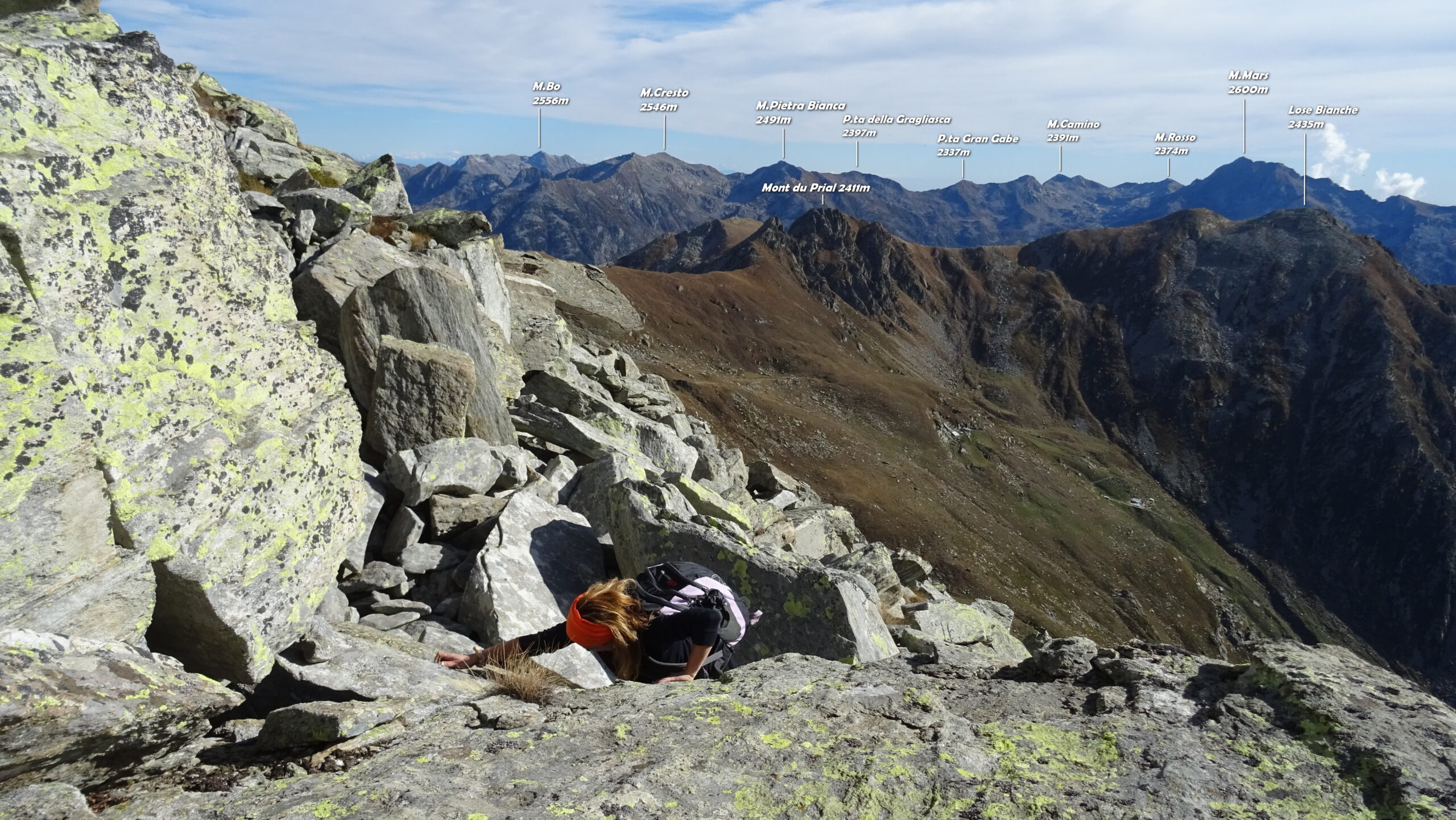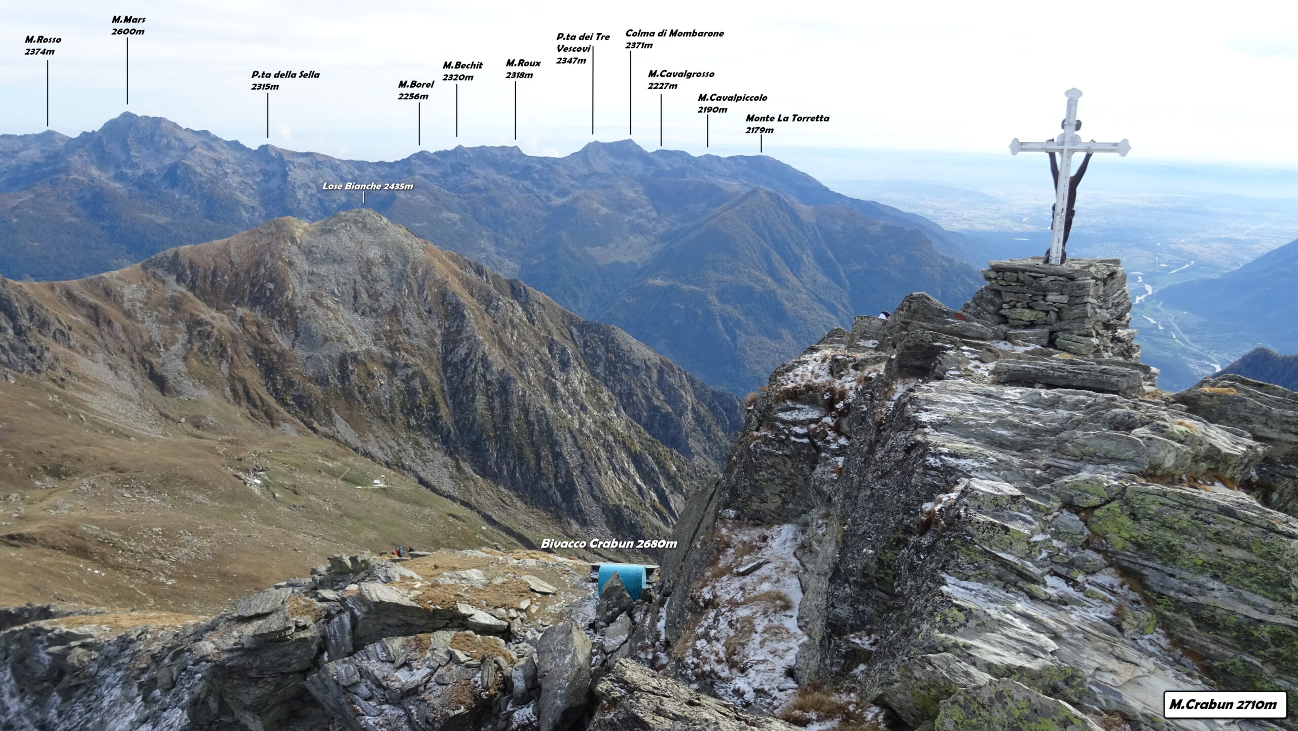 Lasciato le macchine al parcheggio di Fey Dessus. La sbarra era aperta, ma il segnale di divieto di transito è chiaro, dunque partiamo di lì, aggiungendo circa 200m di D+ e poco più di mezzora per raggiungere Prà. Da lì come da relazione saliamo fino all’Alpe Pian 1780m dove cerchiamo di proseguire sulla traccia Gps che avevamo, cercando di effettuare l’anello in salita per la cresta S e non in discesa, come gran parte delle relazioni precedenti. A fatica e senza uno straccio di sentiero raggiungiamo per un ripido tratto di canale erboso l’Alpe Barmat 2014m ,da qui stufi di continuare a cercare traccia come rabdomanti, mandiamo a quel paese il segnale gps, e visto che la giornata con buona visibilità lo consente, decidiamo di salire dritto per dritto prendendo un evidente canale sassoso. Il canale consente di salire direttamente in cresta con passaggi facili, perlopiù a piacere, su solidi blocchi rocciosi ( o quasi), uscendo nei pressi di un’evidente anticima poco prima del M. Crabun. Da qui in circa 15 minuti per cresta facile arriviamo alla caratteristica croce di vetta del M. Crabun. Discesa tranquilla sulla via normale su comodo sentiero riprendendo a Pian la traccia che scende fatta al mattino.
