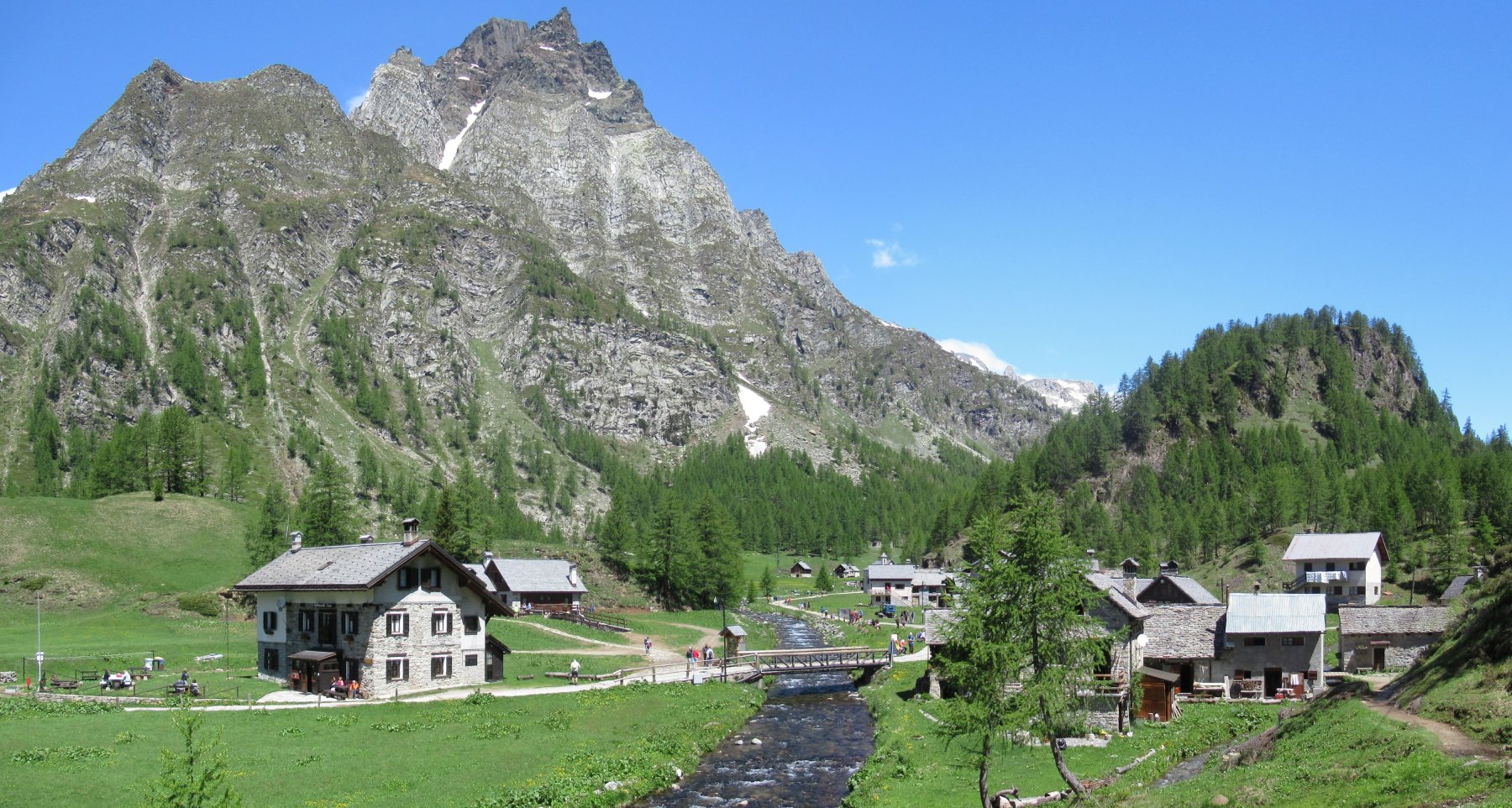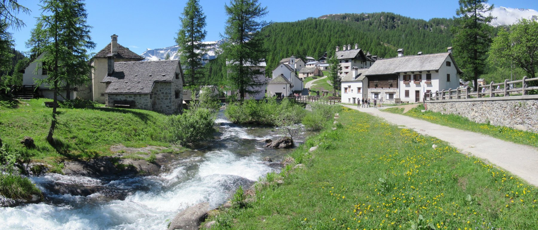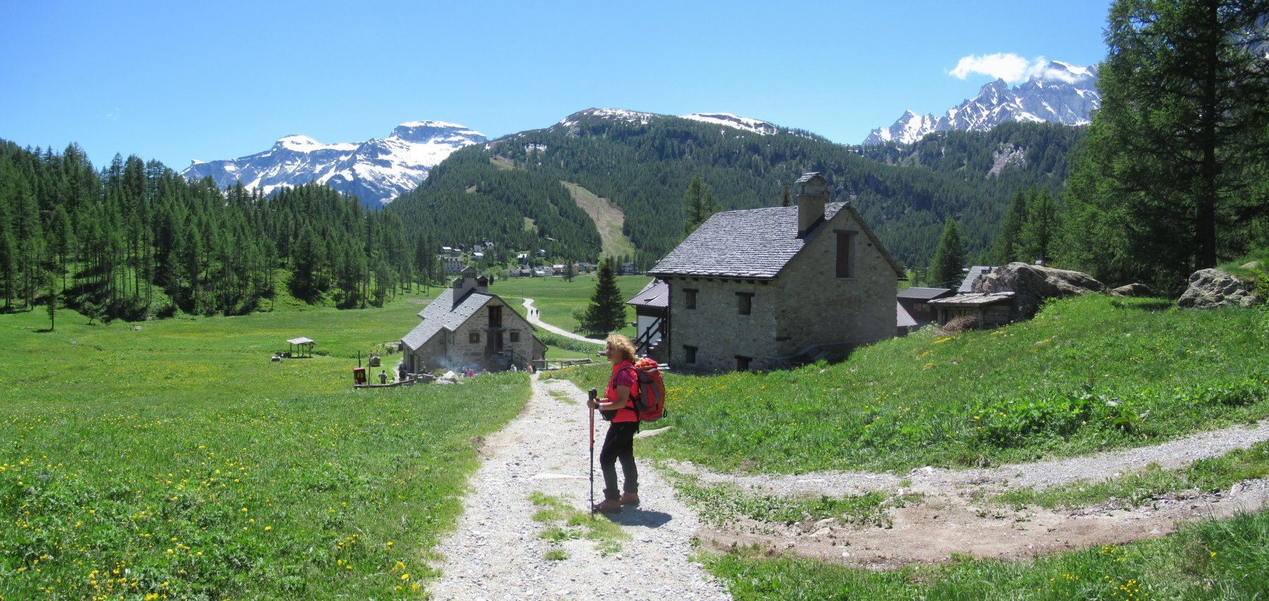 Un’ultima serie di ripidi tornanti e finalmente la salita termina e si prosegue in piano con piacevole camminata fino a raggiungere l’area parcheggio dell’Alpe Devero e quindi la piana dell’Alpe. Raggiunta la chiesetta della frazione (Frazione ai Ponti) si prende a destra la bella mulattiera che quasi pianeggiante, fra boschi di larici, porta a Crampiolo.