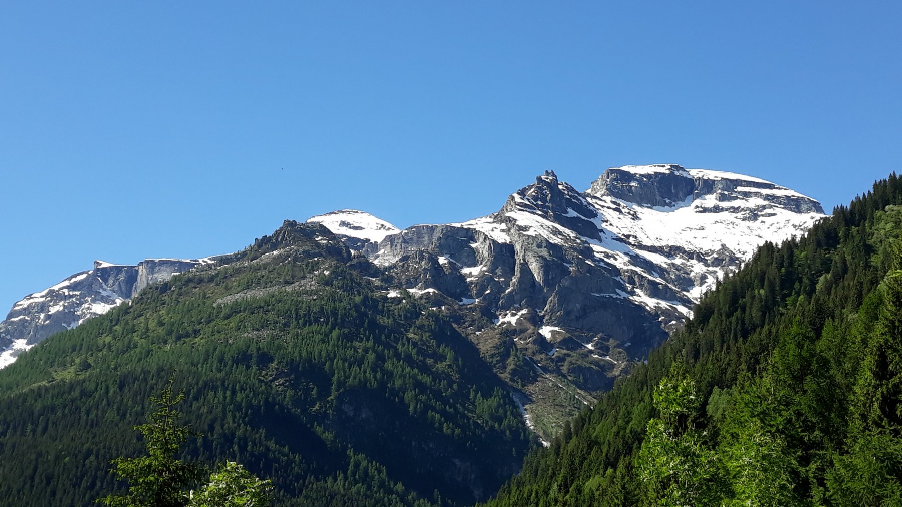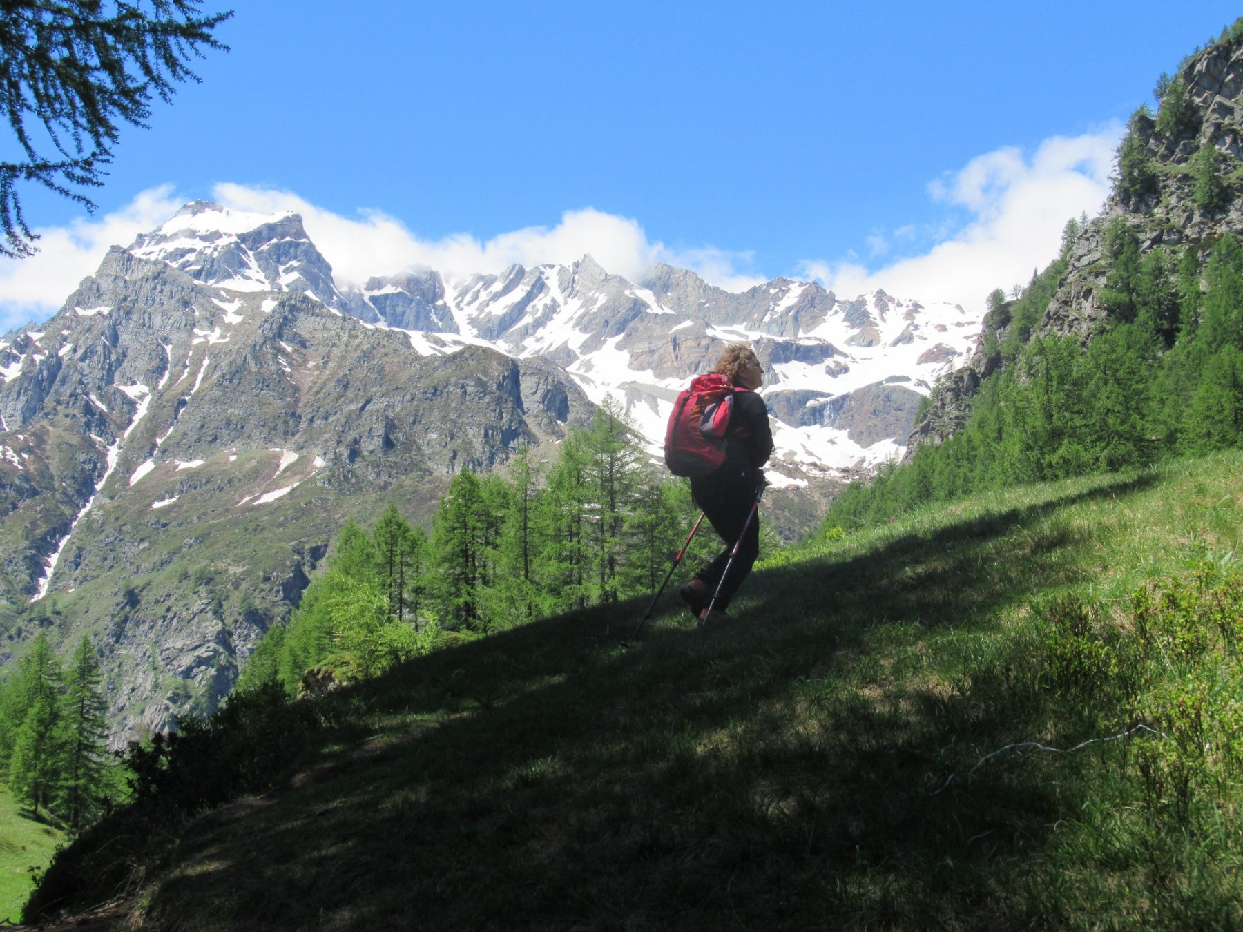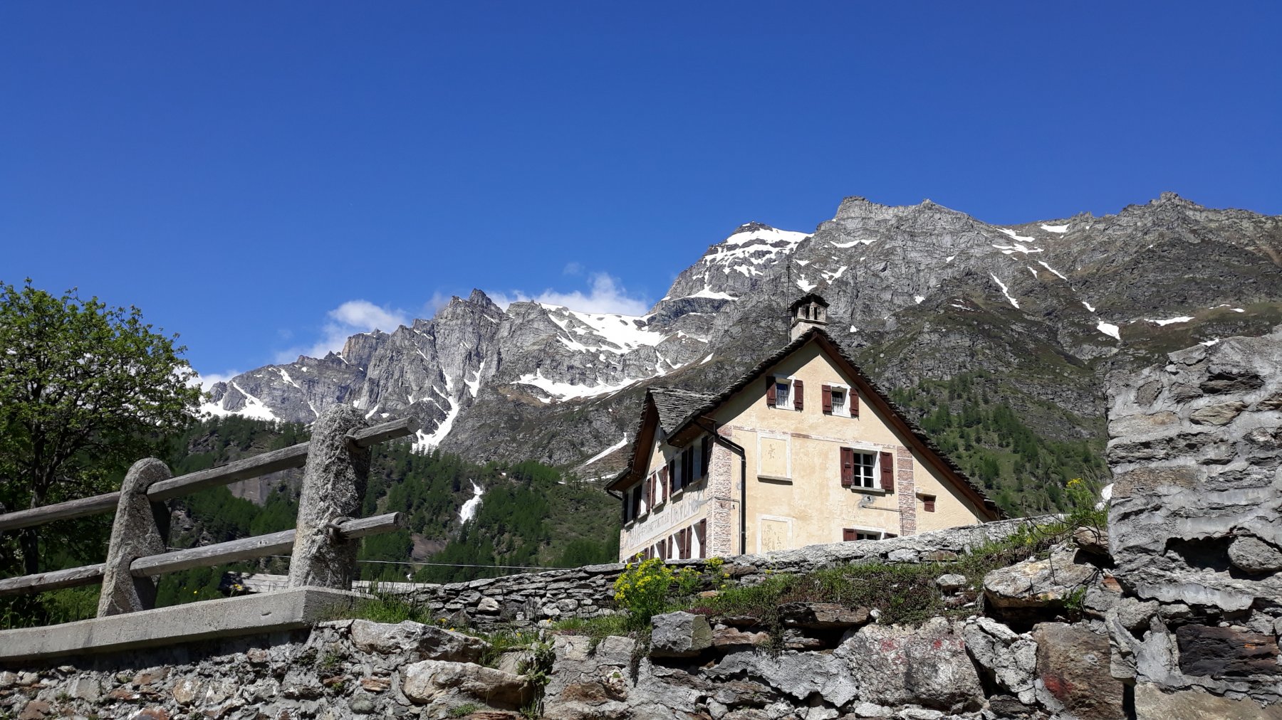 Un’ultima serie di ripidi tornanti e finalmente la salita termina e si prosegue in piano con piacevole camminata fino a raggiungere l’area parcheggio dell’Alpe Devero e quindi la piana dell’Alpe. Raggiunta la chiesetta della frazione (Frazione ai Ponti) si prende a destra la bella mulattiera che quasi pianeggiante, fra boschi di larici, porta a Crampiolo.