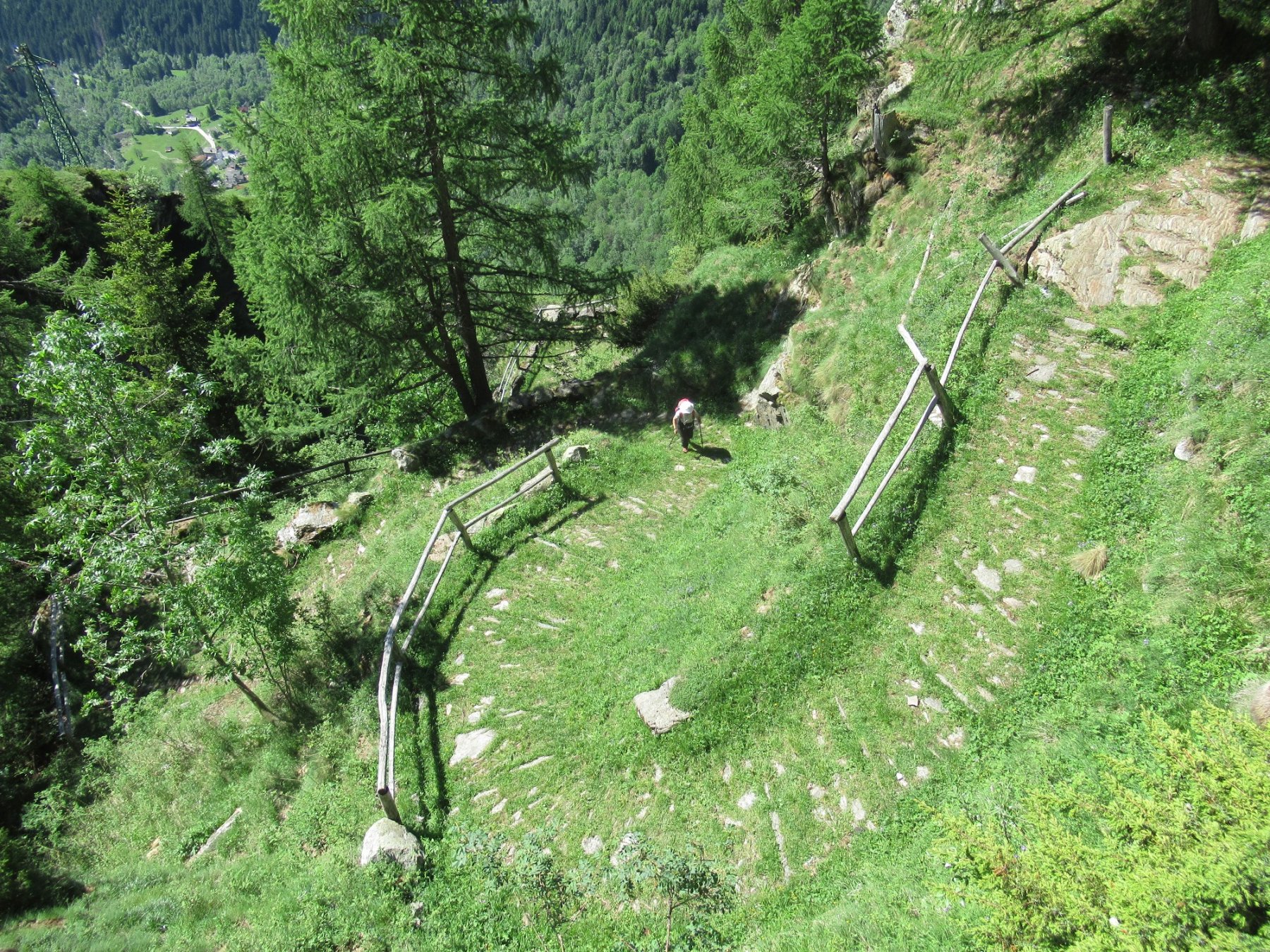 Si prende a destra e con un traverso ci si porta sotto la bastionata rocciosa; da qui la mulattiera sempre molto bella e larga si inerpica in un canale con infiniti tornanti. Si incrociano le condotte forzate e si raggiunge la Forcola, un gruppo di ruderi con una cappella, dove arriva anche il sentiero che parte dal parcheggio della prima galleria.