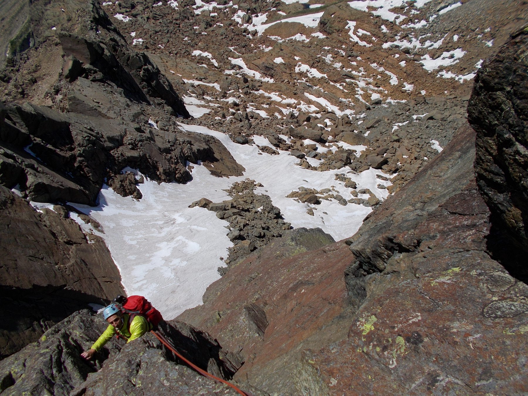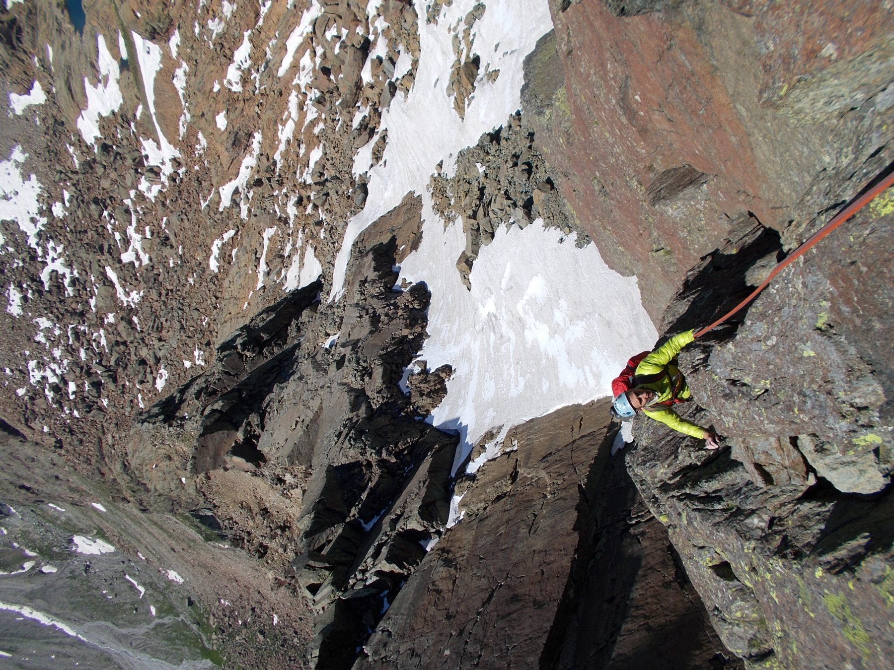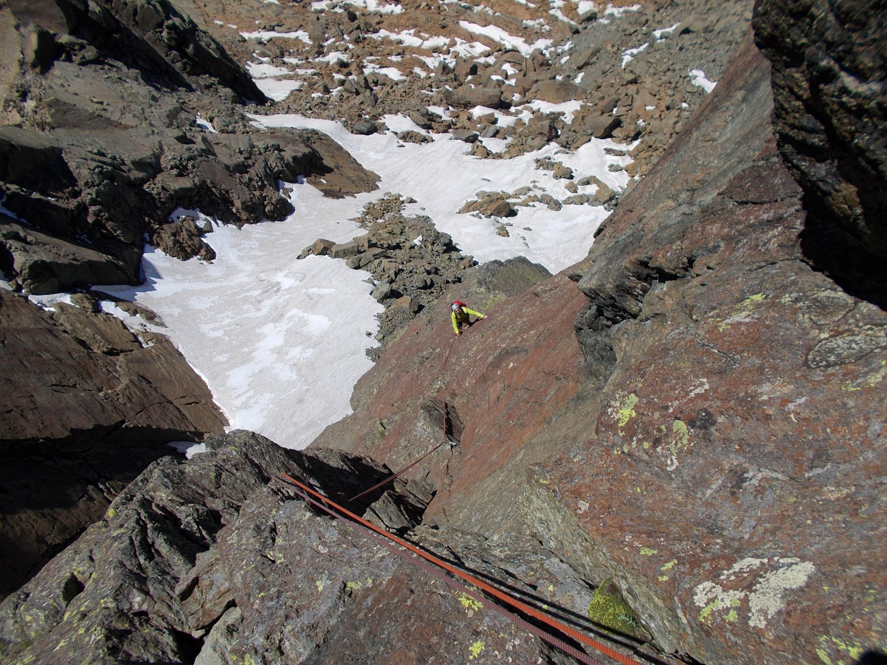 Conviene comunque portarsi prima un po’ verso la parete O, e poi rientrare verso lo spigolo, per massi, facili rocce e tracce di neve, fino a raggiungere una evidente ampia terrazza alla base dello spigolo, caratterizzata da un chiodo di sosta e riconoscibile per la presenza, sulla dx, del diedro che caratterizza la prima lunghezza della via.