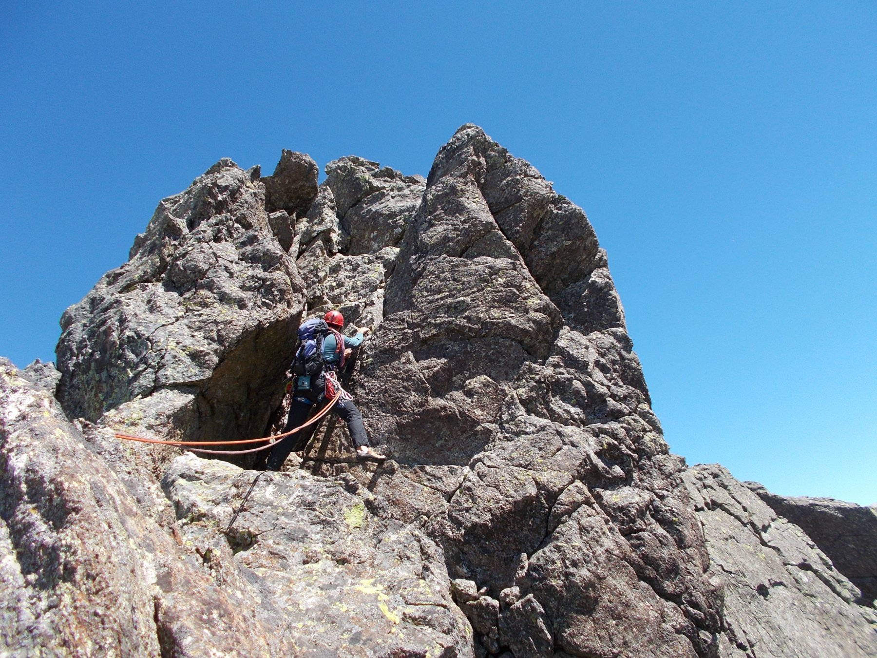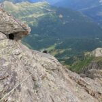 L5:Dalla sosta si sale dritto per rocce via via più semplici (III+), fino ad uscire sulle rocce sommitali della vetta, che si raggiunge facilmente in conserva o tramite un altro breve tiro.