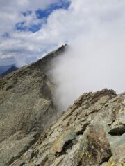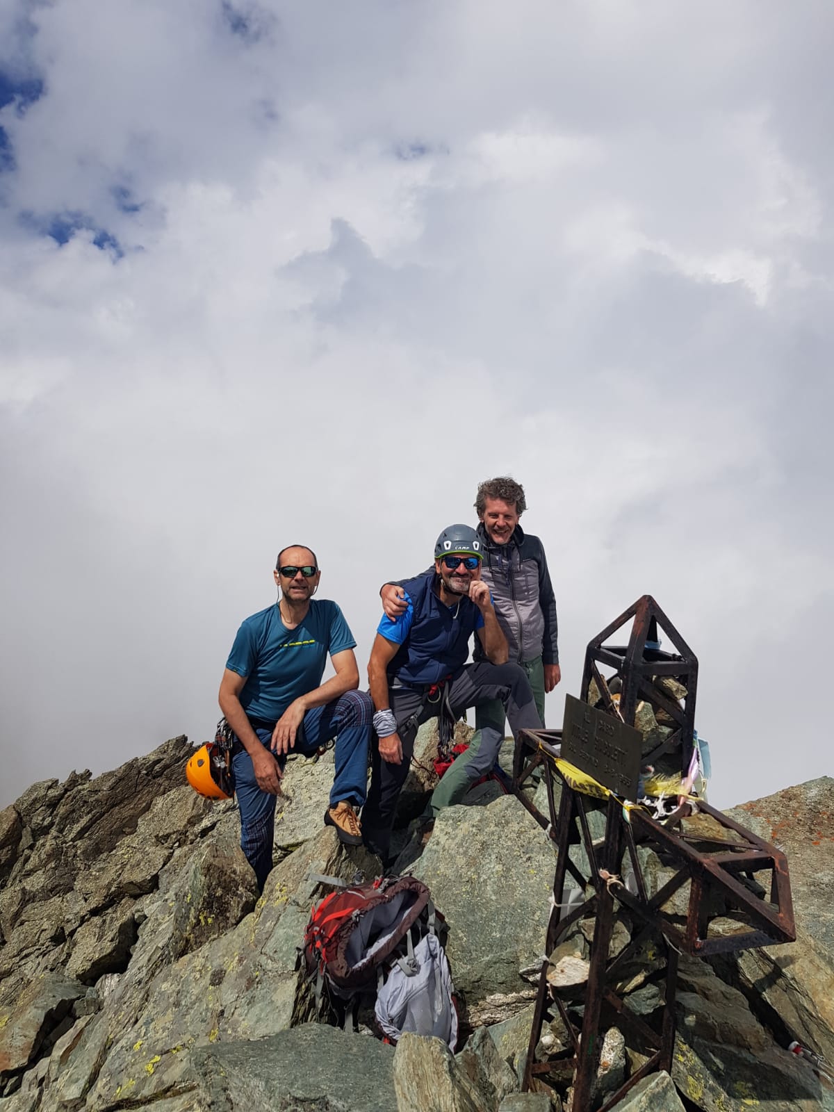 Con Mauro Burdino e Diego Vescovo. Dal termine della via, continuiamo vero Punta Udine prima lungo la cresta, poi percorrendo la cengia erbosa sulla destra (Sud) nel senso di marcia, con un traverso andiamo ad intercettare la via Burdino – Genero – Serafino della cresta Est e ne percorriamo gli ultimi tre tiri. Soluzione un po’ barocca, forse (verosimilmente continuando sulla cresta Roma Udine si fa prima a raggiungere la vetta), ma Mauro ed io siamo affezionati alla cresta.