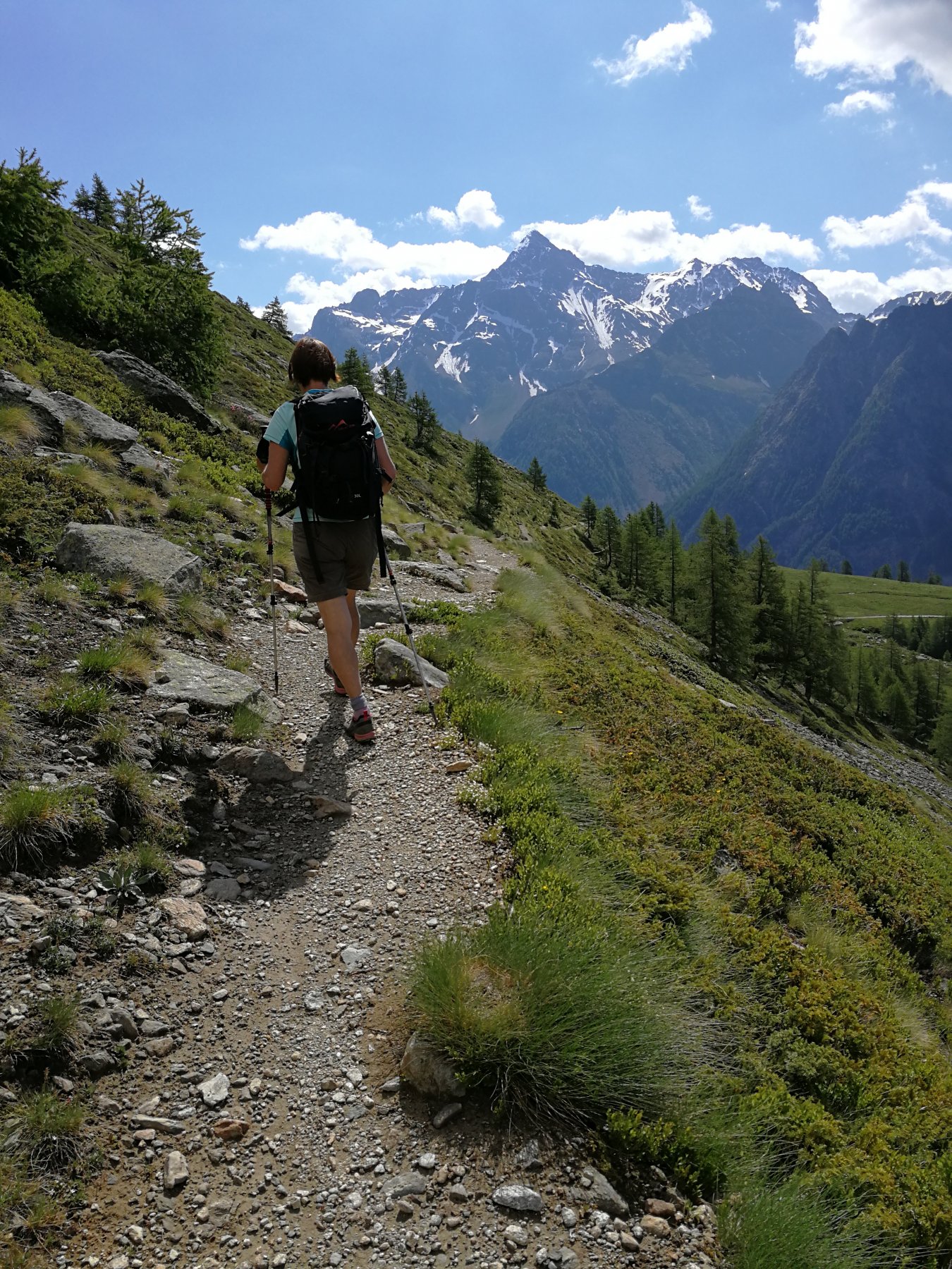 Dal parcheggio che precede il piccolo gruppo di baite di Ruz si prosegue seguendo la strada che attraversa la graziosa borgata, per poi continuare sulla stessa affrontando una rapida successione di tornanti che consentono di guadagnare subito quota senza troppa fatica. Il bosco di larici regala una piacevole ombra ma allo stesso tempo lascia spazio a belle vedute panoramiche.