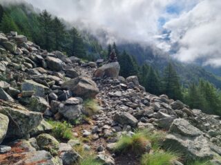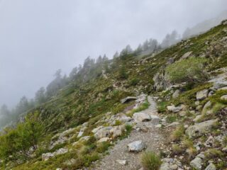 Mordi e fuggi mattutino. Sentiero bagnato dalla ormai consueta pioggia notturna. Incontrati i gestori che scendevano lasciando il rifugio chiuso.