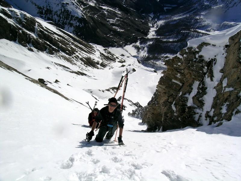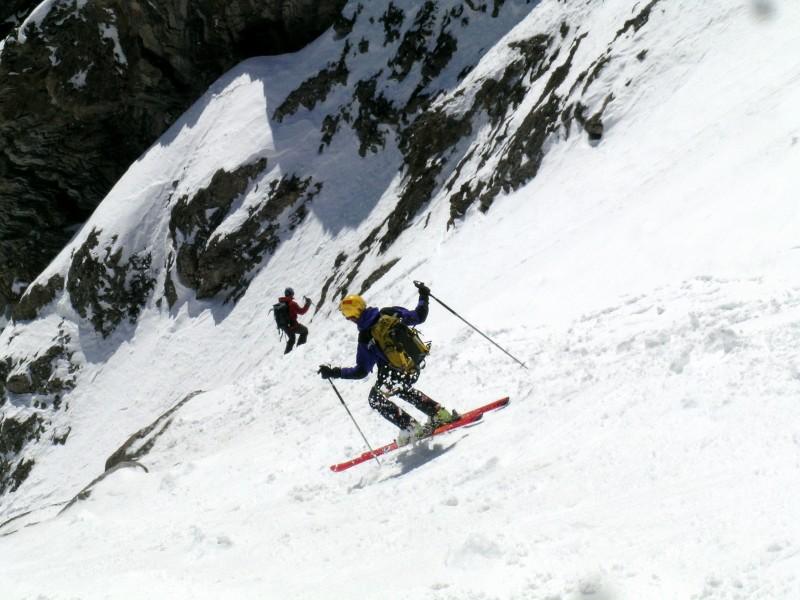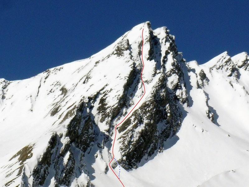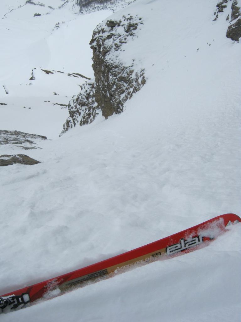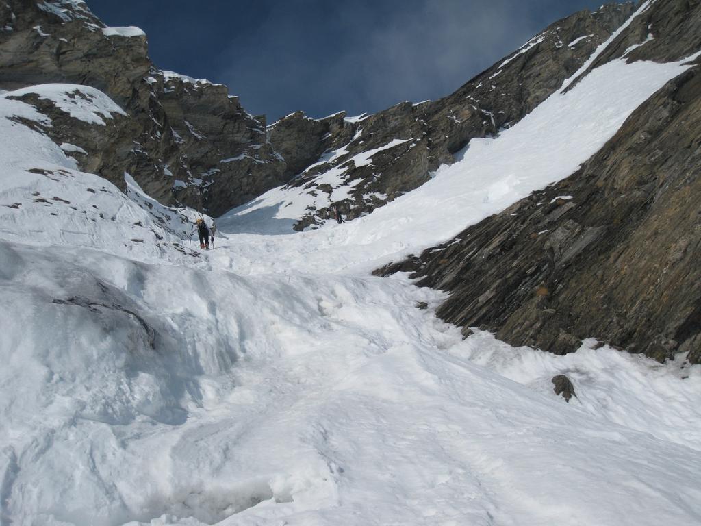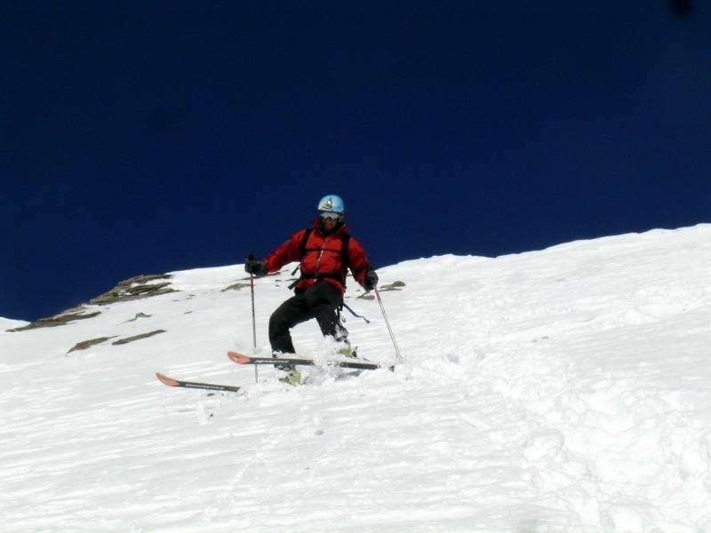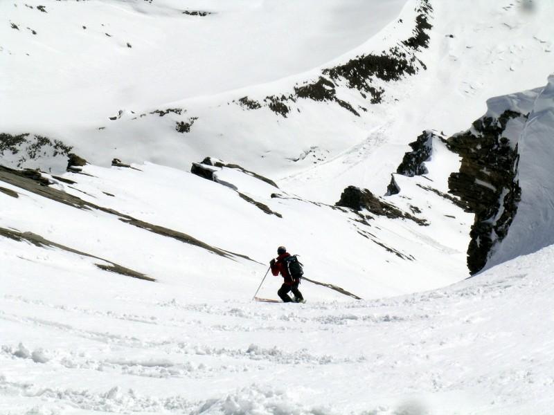 Superare un risalto con cascata (7m, 65-70°) che si può aggirare da sx salendo su cengia esposta (da percorrersi in discesa, 45°), percorrere prima dritti e poi verso dx la prima parte i canale larga (40° grassi) fino ad un evidente sterttoia che si supera con una corta e ripida rampetta sulla contropendenza sx, continuare dritti (40-45°) fino a reperire sulla sx la stretta rampa che porta nel canale superiore: da qui in poi le pendenze si fanno più accentuate, per 250m si sta con una certa regolarità tra 45-50° sciando spesso sulla larga contropendenza di dx salendo fino an incontrare una strettoia (20m 50°) che porta nel catinetto sotto la cresta.