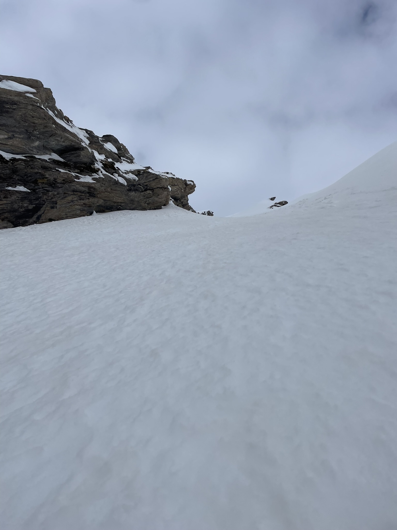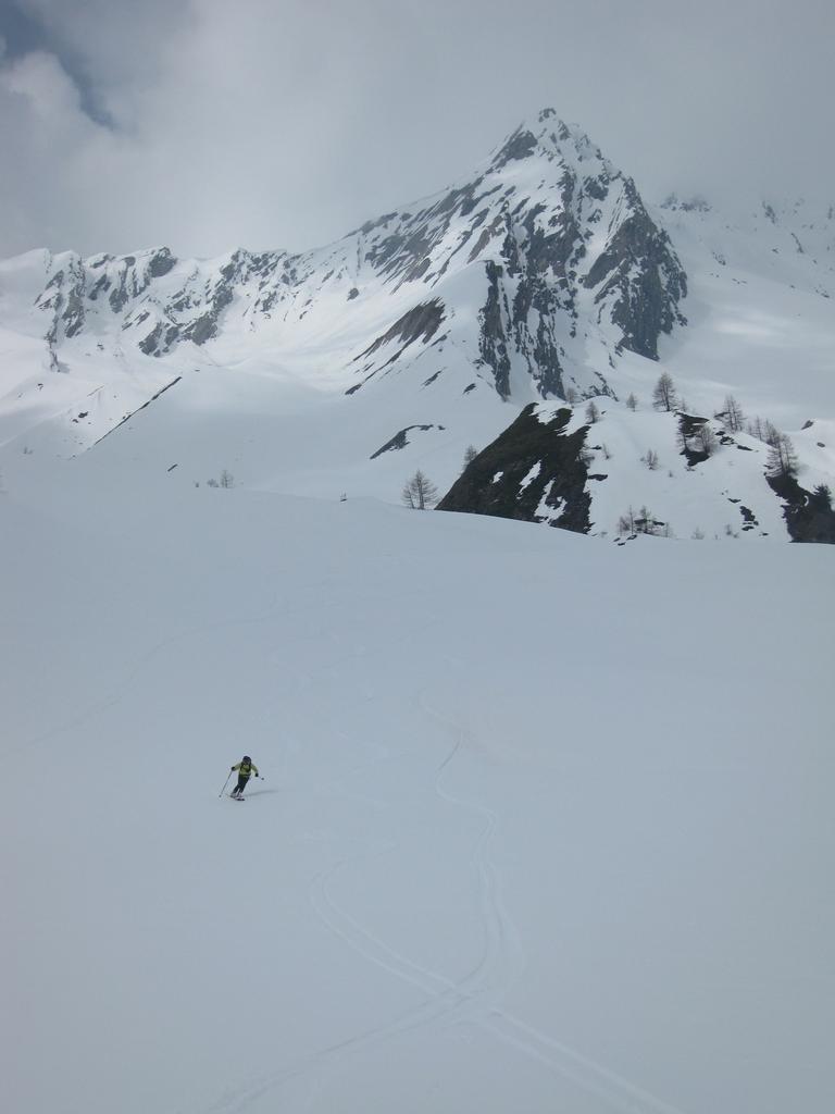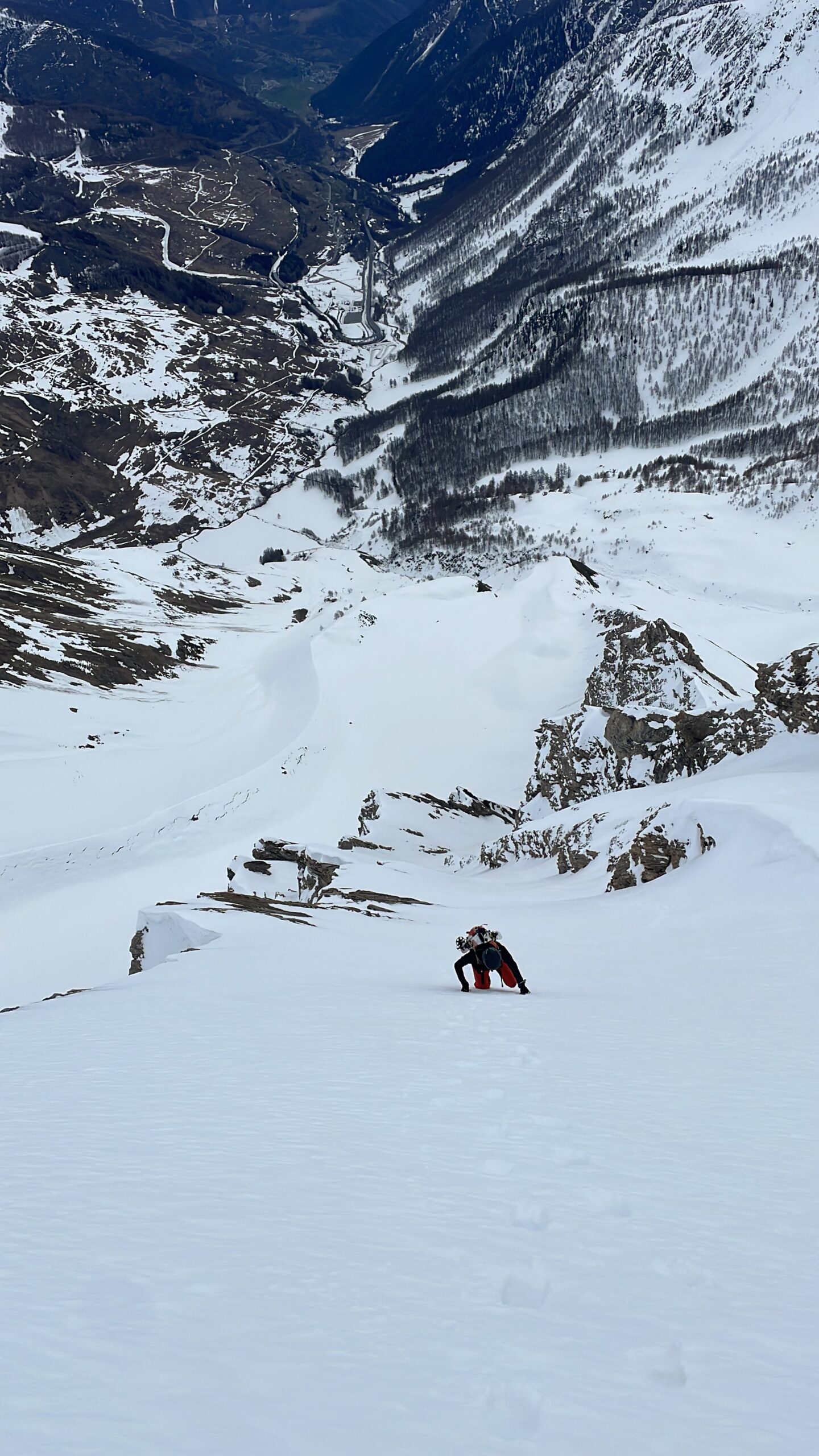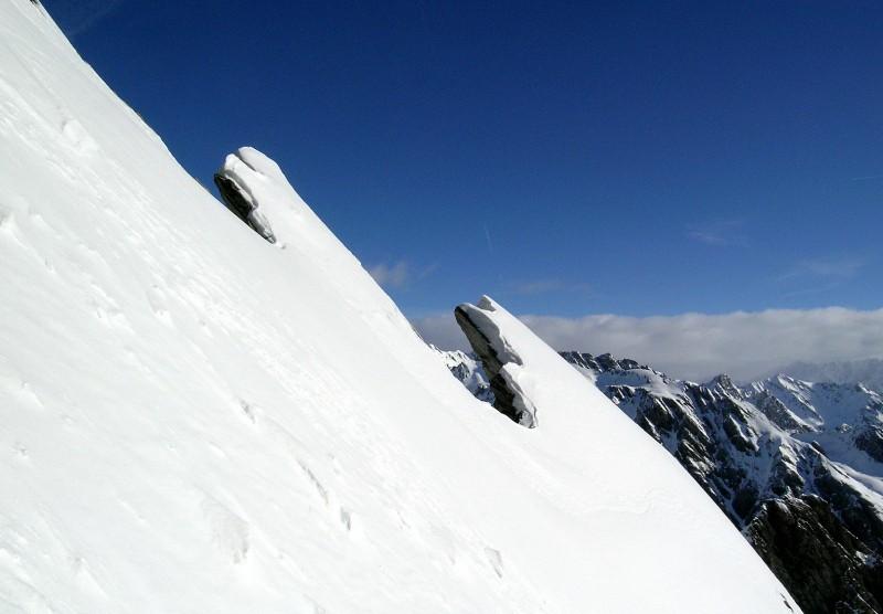 Dalla cresta affacciarsi sull’enorme pala a circa 50m dalla punta su pendenze di 45° abbondanti (ochhio in questo punto agli accumuli data l’eposizione che poggiano direttamente sulle placche scistose sottostanti.