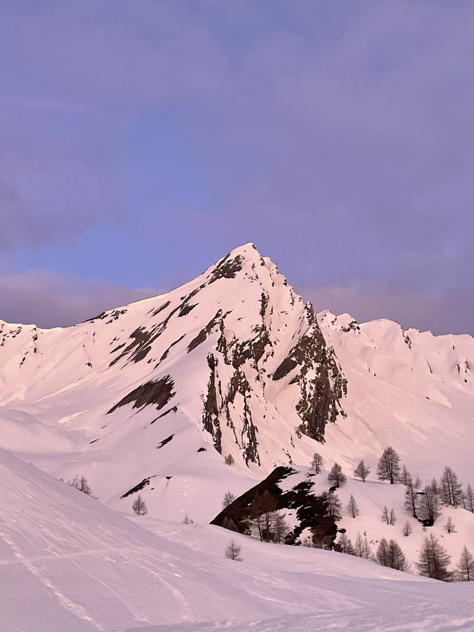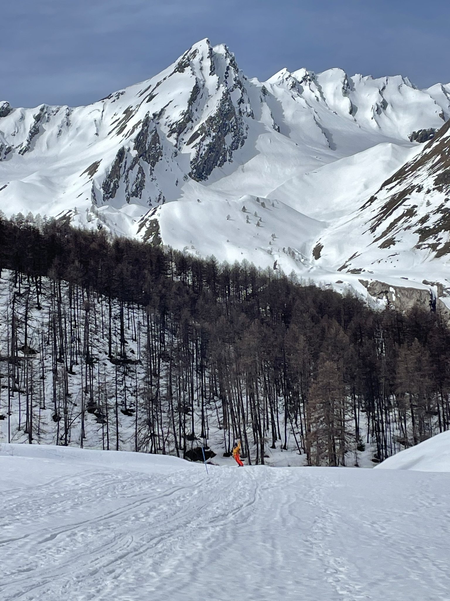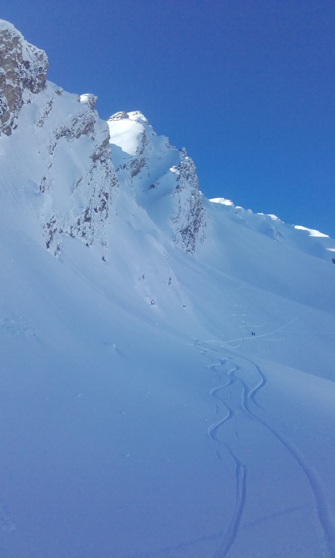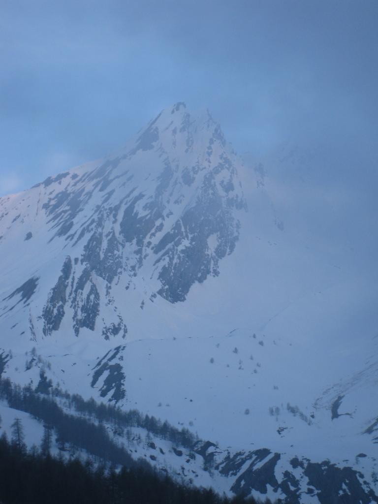 Dalla cresta affacciarsi sull’enorme pala a circa 50m dalla punta su pendenze di 45° abbondanti (ochhio in questo punto agli accumuli data l’eposizione che poggiano direttamente sulle placche scistose sottostanti.