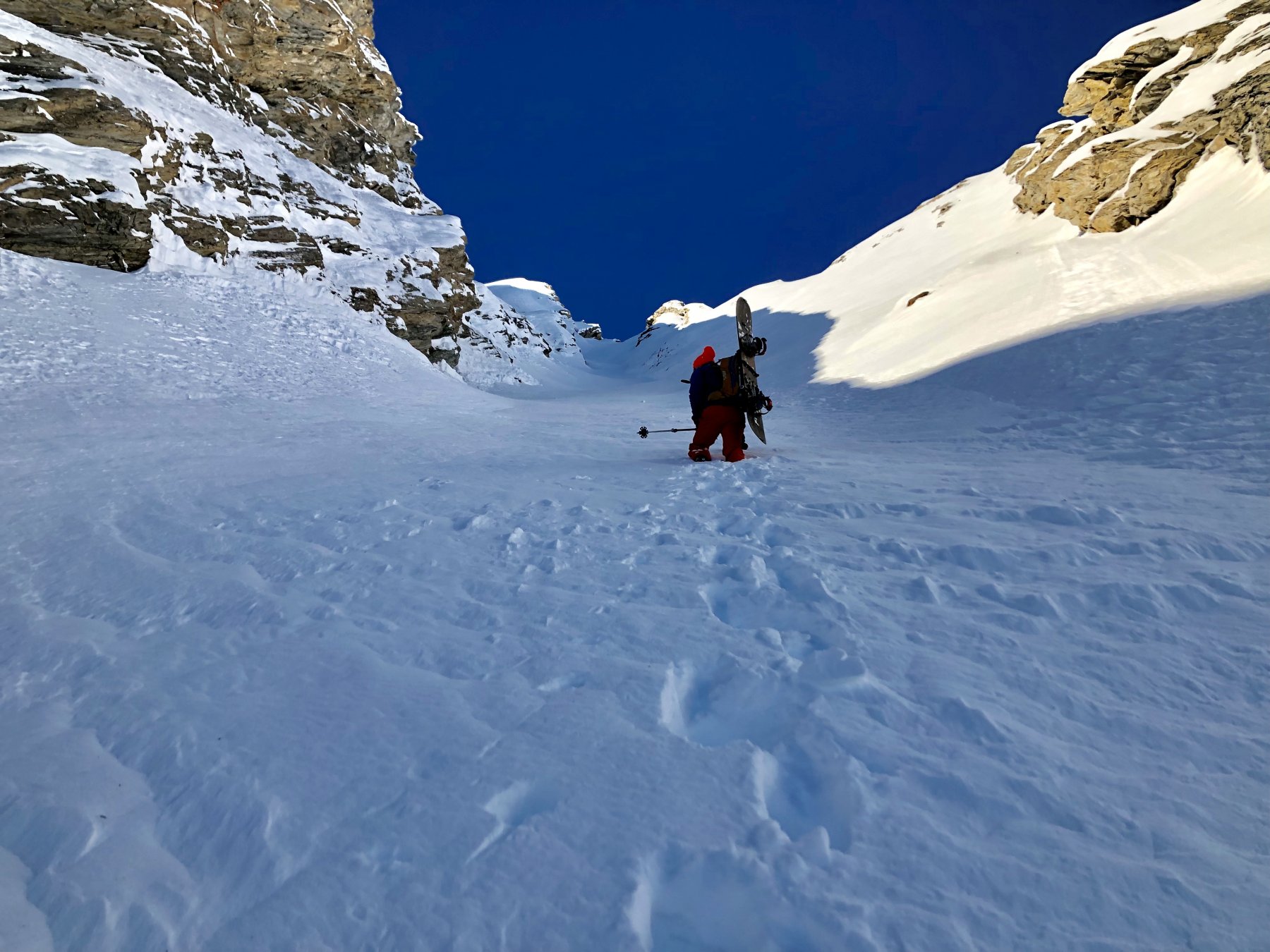 In primavera il couloir è molto esposto all'azione del sole già dalle prime ore del mattino e per buona parte della giornata, in inverno torna in ombra molto più rapidamente almeno nella sua parte alta.