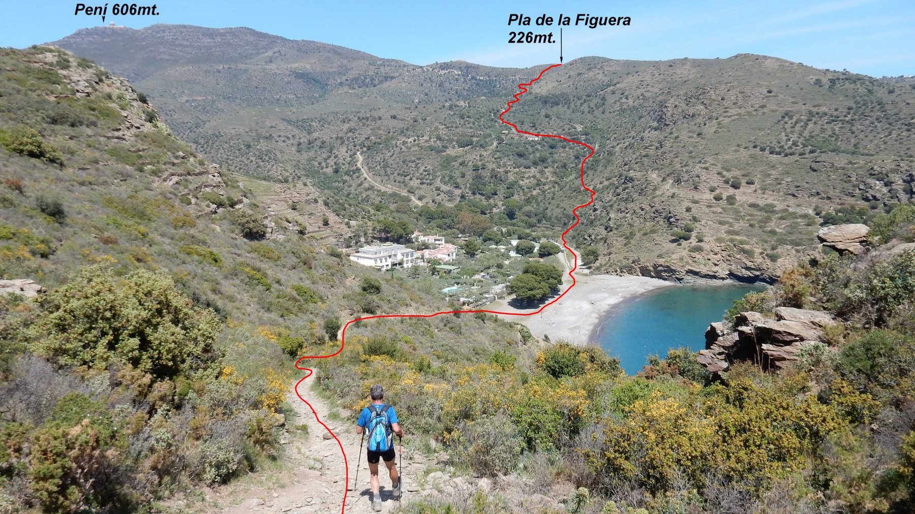 La strada inizialmente è asfaltata e raggiunge un sito del Neolitico con un dolmen in ottime condizioni. Superate le ultime abitazioni diventa sterrata e raggiunge la Cala Montjoy, ampia e incastonata tra scogliere.