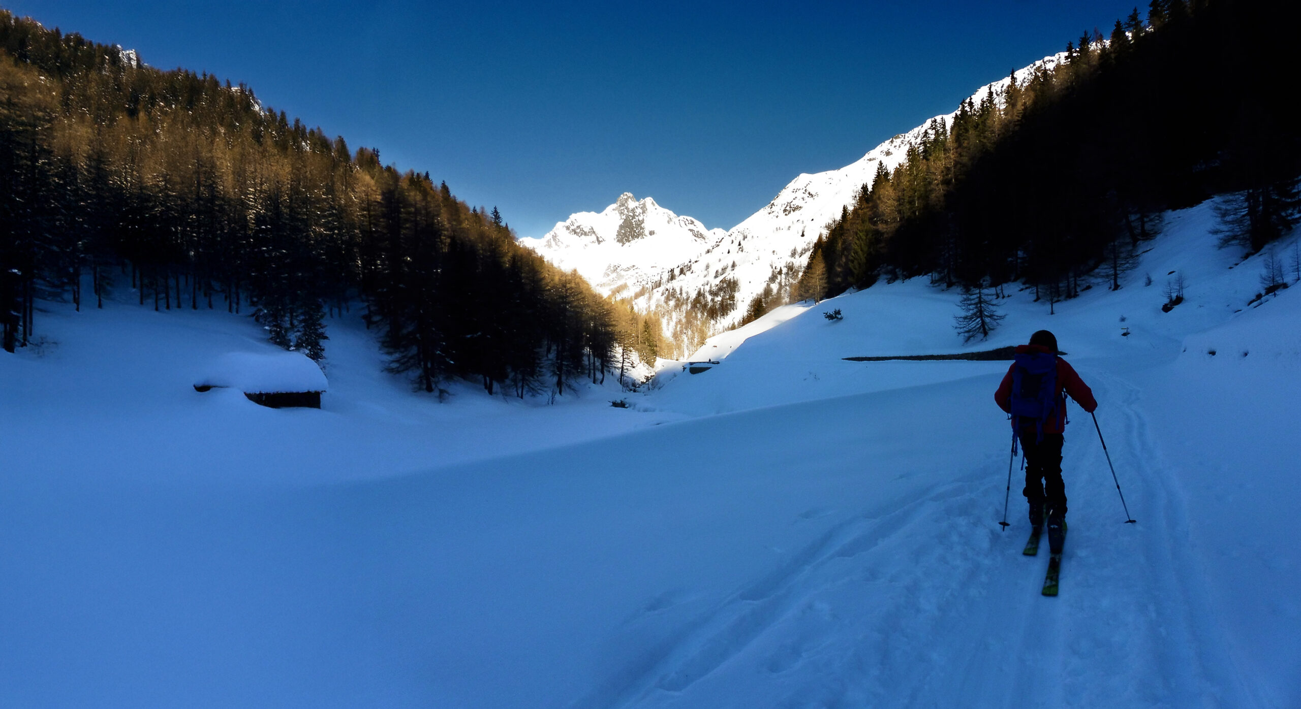 Procedere sulla strada innevata seguendola fedelmente sino nel ripiano in cui si attraversa il torrente del Gran San Bernardo.