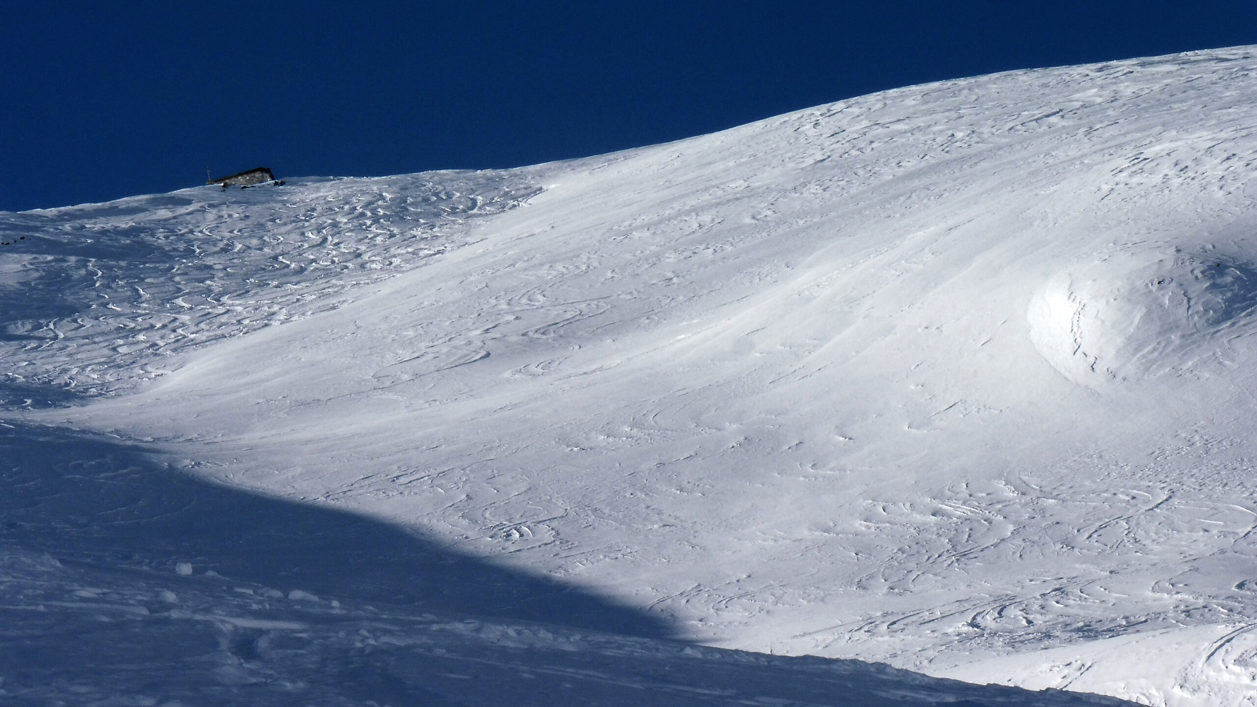 Continuare tagliando i tornanti della pista sino a raggiungere un leggero ripiano poco fuori dalla fascia boschiva, a quota 2050m circa. Proseguire la salita senza percorso obbligato in direzione sud-ovest indirizzandosi verso la vetta, visibile a tratti per via del bivacco sommitale. All’aumentare della pendenza portarsi verso destra sino a raggiungere la dorsale spartiacque, da qui in pochi minuti risalire la dorsale sino al bivacco di vetta a quota 2609m.