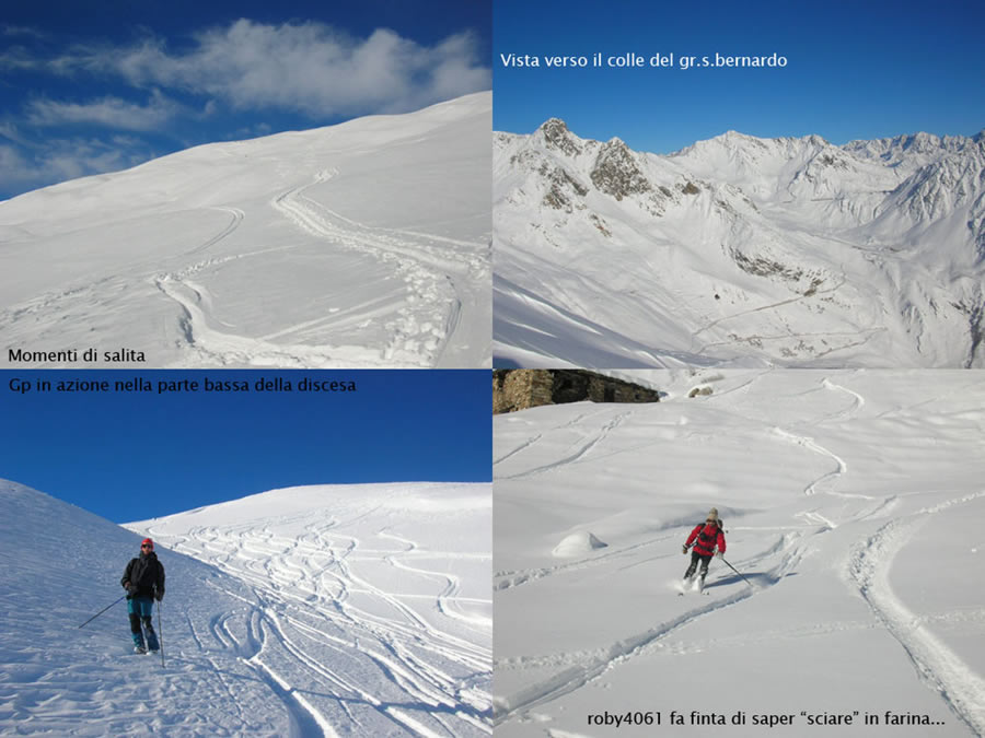 inizio ufficiale della stagione 2005/06… in questa valle neve c’è,ma con l’alta pressione penso cambieranno presto quantomeno a sud. 5 amici sono andati verso il col serena, in 3 per evitare di stare nel congelatore tutto il giorno (-11° alla partenza) ci siamo diretti verso la testa di crevacol. bellissima la neve nella parte bassa, polvere pura, 40-50 cm su quasi tutto il percorso. salita comoda, presto al sole per fortuna, senza problemi. bello anche il percorso, che passa sul tracciato di una vecchia pista al momento non battuta. suggestivo il tratto finale su una dorsale a dossi che inganna più volte facendoti credere di essere in cima… sulla vetta c’è una casetta. panorama splendido, tutta la valle del gran san bernardo pare ben innevata (alcuni valloni e pendii molto carichi, specie verso il col malatrà). sota in vetta al riparo dal vento, panettoncino per festeggiare e poi via in discesa. sciolta la ruggine in poche curve, neve buona, scegliendo le vallette esposte a ovest farina pura, altrove comincia a trasformarsi. pochi accumuli da vento facilmente visibili, un po di crosta morbida, ma in genere bella sciata. abbiamo ravanato per un canalino nell’unico tratto di bosco, poi molto belli i pendii dell’alpe merdeux, tutta farina, fino al parcheggio che è sempre stato in ombra e glaciale… ho toccato una sola pietra nel bosco. innevamento buono, ma credo che in pochi giorni sulle esposizioni a sud le condizioni peggioreranno presto. è bello dopo 6 mesi ricominciare a muoversi con le pelli… era giugno e c’erano i prati fioriti quando ho chiuso la stagione, ora c’è il freddo e poca neve, in mezzo due stagioni… viva la montagna! un saluto a tutta la compagnia che a gite finite si è riunita per la birra… buon inizio di stagione a tutti.
