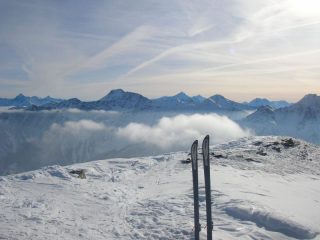 un mese dopo di nuovo qui… meta originaria era il col malatrà, ma vista la quantità di neve, del tutto inconsistente e l’assenza di tracce, abbiamo ripiegato sulla crevacol. dalla comba di merdeux abbiamo traversato il versante ovest fino a ritrovare una traccia di salita nei pressi dell’alpe merdeux. risaliti per questa traccia da skyrunner (è un vizio ormai fare questo tipo di tracce tagliagambe..), per un canalino ripido siamo tornati sulla dorsale secondaria di salita, sfruttando le chiazze di neve (il vento ha lavorato molto..). assenza di vento sulla punta. discesa per la dorsale prima, sfruttando le placche da vento dure con un velo di farina sopra, divertente. neve comunque molto varia, ogni tanto si trovava crosta, per cui ci siamo diretti sulla pista nera (che di nera ci pare abbia ben poco..) di crevacol, seguita fino a 1900 m circa, poi l’abbiamo abbandonata, scendendo per pendii di buona farina (pure troppa) con qualche zona crostosa traditrice, fino ad intercettare la stradina proveniente dal col serena. insomma, abbiamo salvato la giornata. tempo che da nuvolo si è aperto a fine mattinata. personalmente non so se consigliarla. meglio dirigersi su altri itinerari, meno battuti da sole e vento. in tutta l’alta valle cmq l’innevamento è relativamente buono. un saluto ai compagni di gita cecilia e renato.
