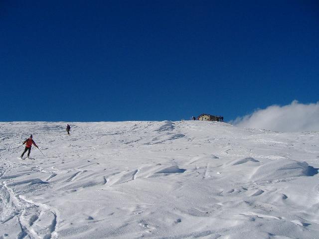 saliti per l’itinerario classico, versante sud. la neve è scarsa e molto lavorata dal vento nella parte alta, dove si trovano diversi tratti spelati. in discesa, nella parte alta, ci siamo comunque divertiti collegando una serie di placche portanti con qualche cm di farina. x evitare la parte bassa, con neve non portante e addirittura marcia (oggi giornata caldissima), abbiamo puntato verso le piste battute…
