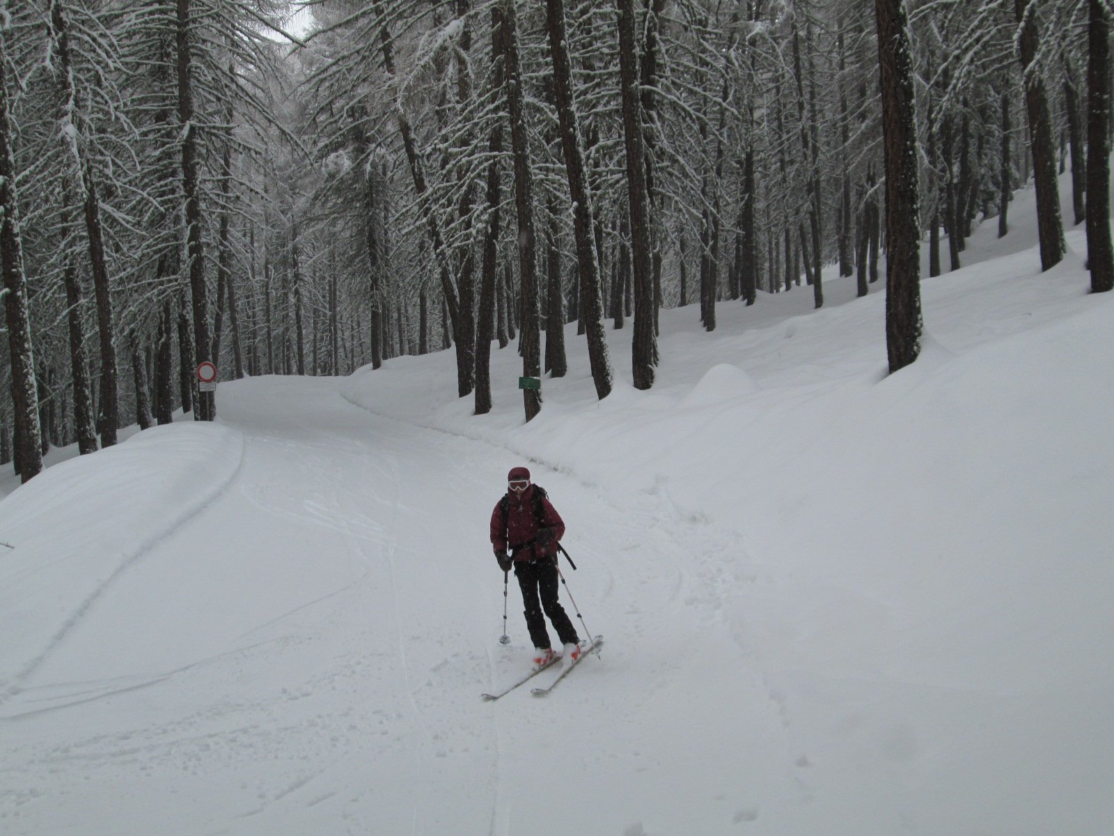 In partenza per una settimana in Svizzera, ci siamo fermati lungo la strada per una breve gitarella. Visto il meteo pessimo, con nevischio e visibilità scarsa, abbiamo optato per risalire le piste di Crevacol. Partenza alle 10 dal parcheggio con temperatura intorno allo 0, quindi neve umida e pesante anche per la pioggia del giorno precedente fino a circa 2.000 metri. Nella parte bassa saliti lungo le piste 10 e 4 chiuse, poi ultima parte sulla stradina della 2. Vedendo il meteo ovviamente ci siamo fermati all’arrivo degli impianti senza raggiungere la cima. Discesa iniziata verso le 13, neve pesante e sfondosa; impossibile pensare di scendere fuori pista, si sprofondava fino al polpaccio nella pauta. Quindi discesa lungo le piste discretamente battute; in alto poca visibilità, meglio ovviamente nel bosco, ma non particolarmente divertente. Arrivati al fondo abbastanza inzuppati. Gita non consigliabile, anche se le nevicate dei giorni successivi e l’abbassamento di temperatura dovrebbero aver sistemato un po’ le cose.
