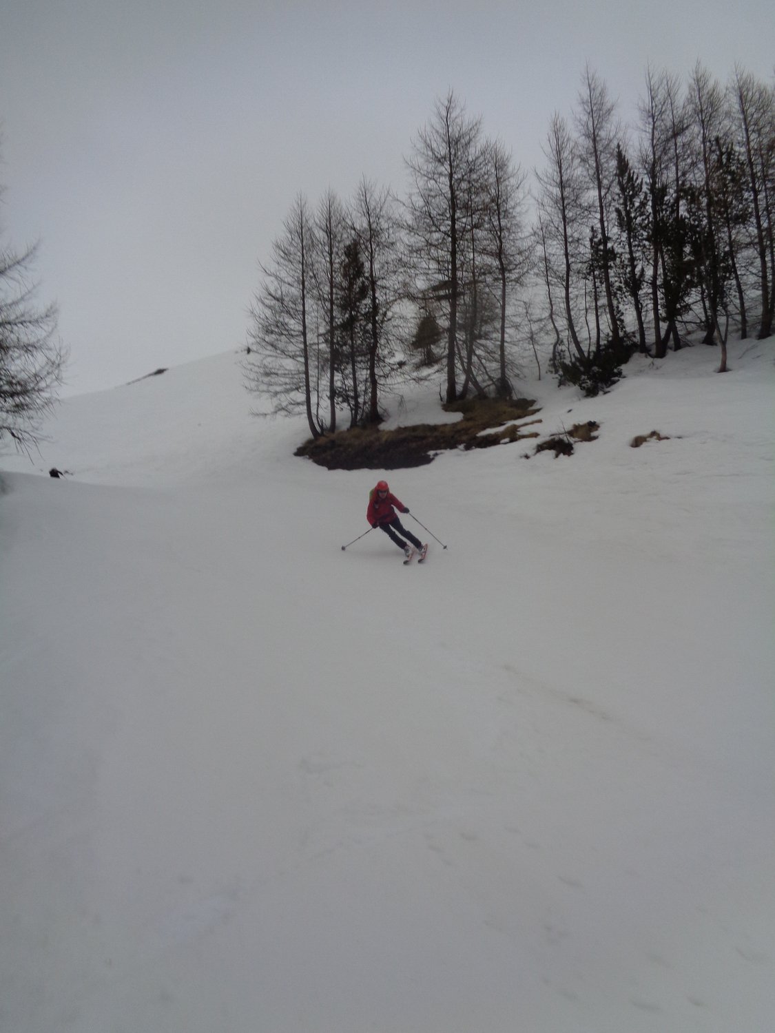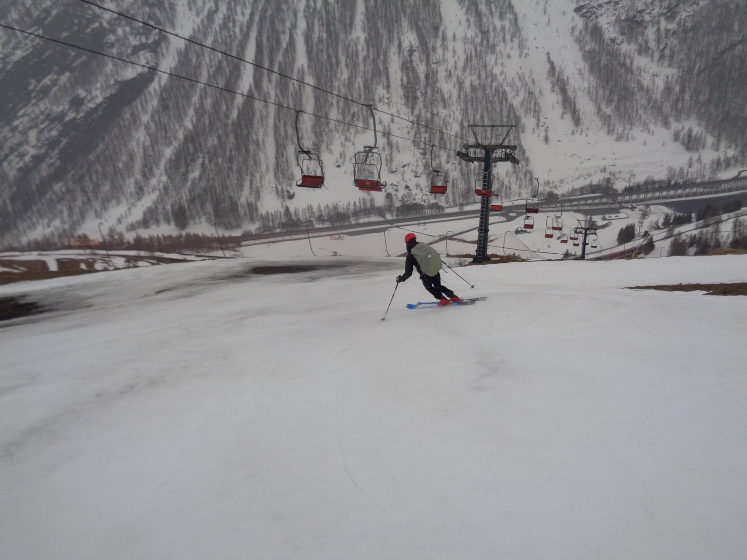 Risalito le piste chiuse con innevamento ancora sufficiente. Ultimissimo tratto a visibilità zero fino in cima e ovviamente panorama nullo. Discesa fino alle piste con poca visibilità ma senza problemi grazie alla neve davvero perfetta!! Poi lunga e gradevole scivolata sulle piste. Oggi non si poteva pretendere di più con rigelo a quote stellari, pioggerella e nuvole. Per noi due giorni valdostani di soddisfazione e di buon ski nonostante la meteo poco accomodante!!