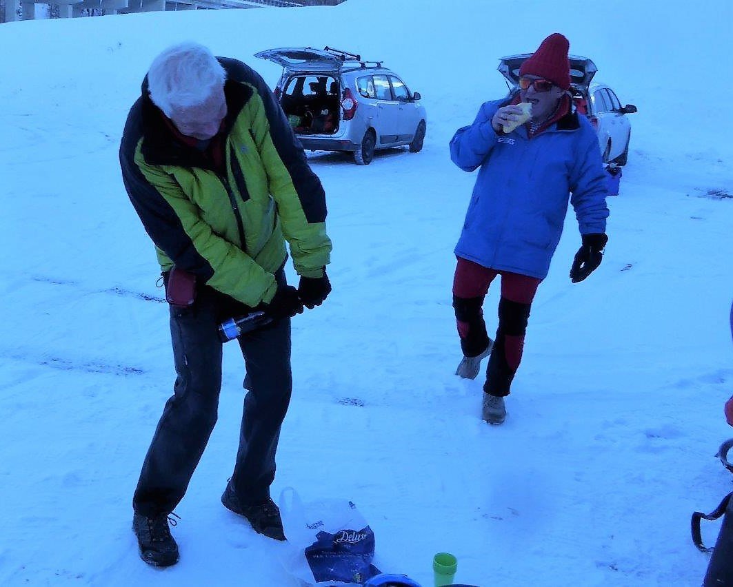 Saliti sul percorso fuori pista passando nei pressi di Merdeux; si parte su 30 cm. di incoraggiante farina ma in breve la situazione cambia e si va dai crostoni da vento a zone ”erbose” a piccoli accumuli sino ad incontrare la pista; oltre questa la più parte è crosta portante pressata da vento; in discesa, sfruttando le linee della crosta sin ove possibile ne viene fuori una discesa più che decente, poi, ad evitare accidenti imbocchiamo la pista, perfetta e desolatamente vuota ……