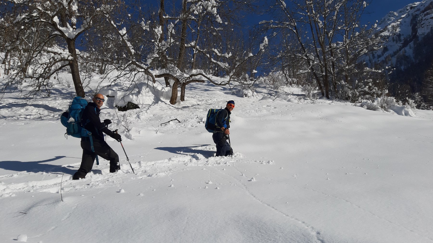 giornata calda e assolata subito dopo una nevicata importante in zona san bernardo; tentata una prima salita al Paglietta con troppa neve impossibile sia da battere che da sciare (1,20 mt di bastoncino tutto dentro)abbiamo deciso di spostarci vs Crevacol. In discesa solo i pendii più ripidi sotto gli impianti e già un pò tracciati dagli sciatori erano appena sciabili; bello e provvidenziale il bivacco dove ci siamo riparati un attimo dalla bufera nel frattempo sopraggiunta!