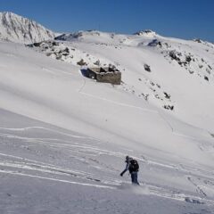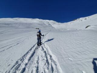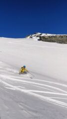 Giornata calda e perfetta, salita piacevole fino al bivacco alla Tete de Crevacol. Diversi Sci alpinisti sul percorso. Discesa dai pendii a sud con ancora ampi spazi intonsi di bella polverella, un po’ più pesante ma sempre divertentissima anche in basso.