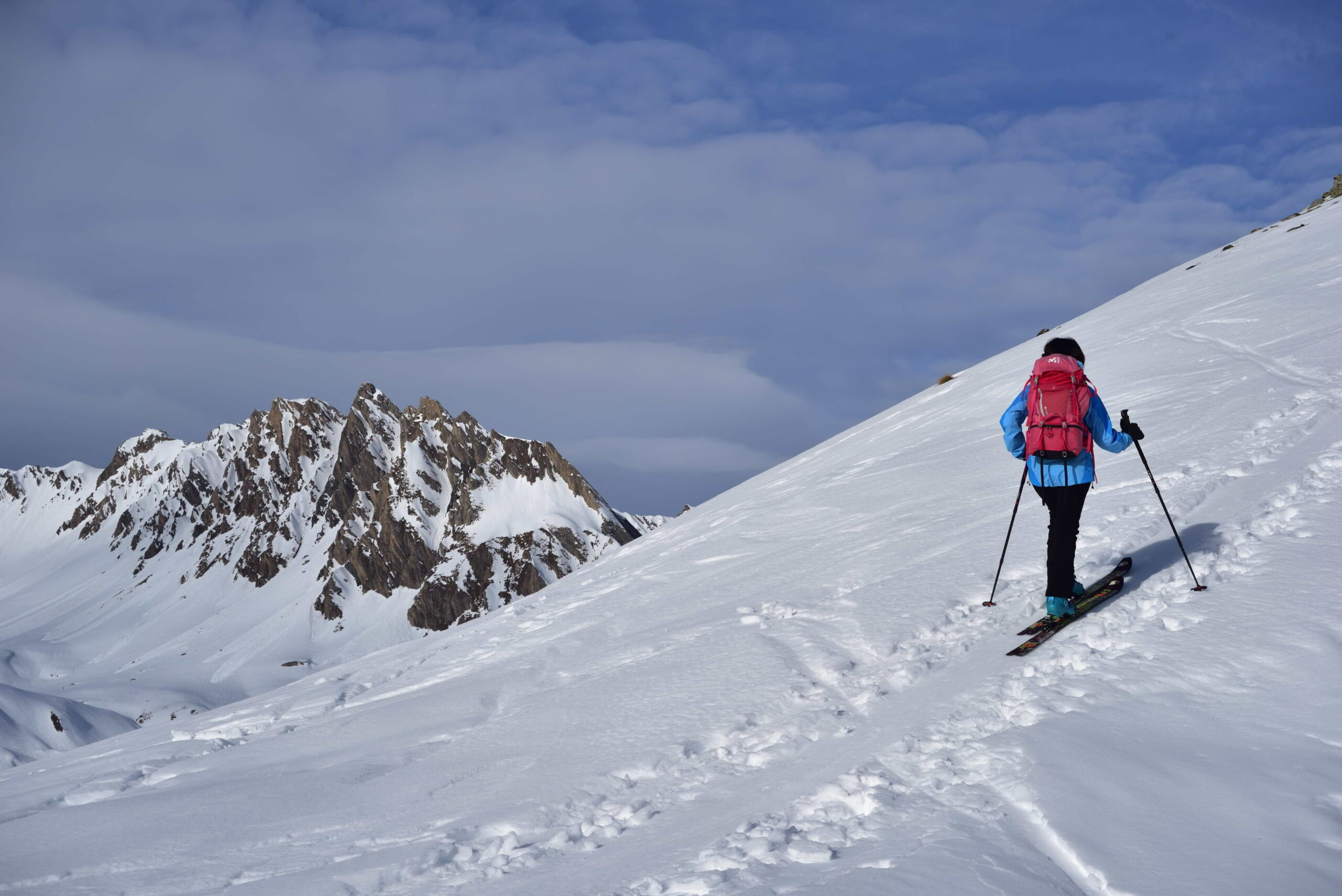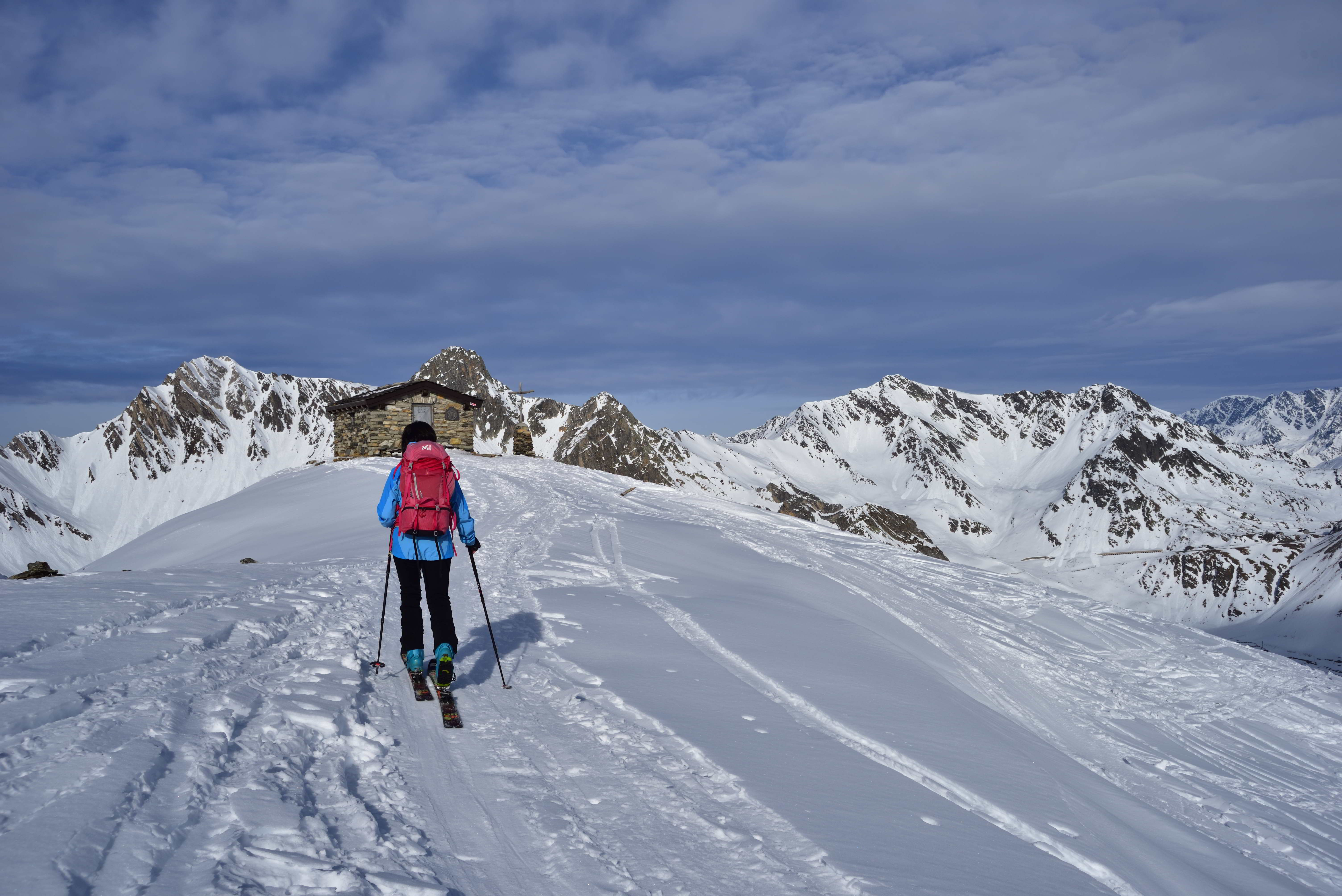 Giornata buona, poco vento (assente in cima) e cielo quasi sereno o velato. Temperature sempre abbastanza alte ma la neve non ha mollato per la velatura del sole. Incontrati solo altri 4 scialpinisti. Con Emily.