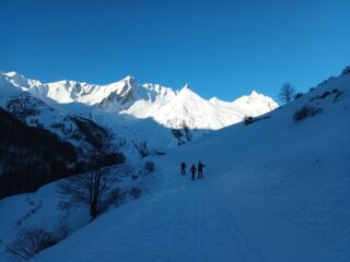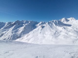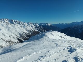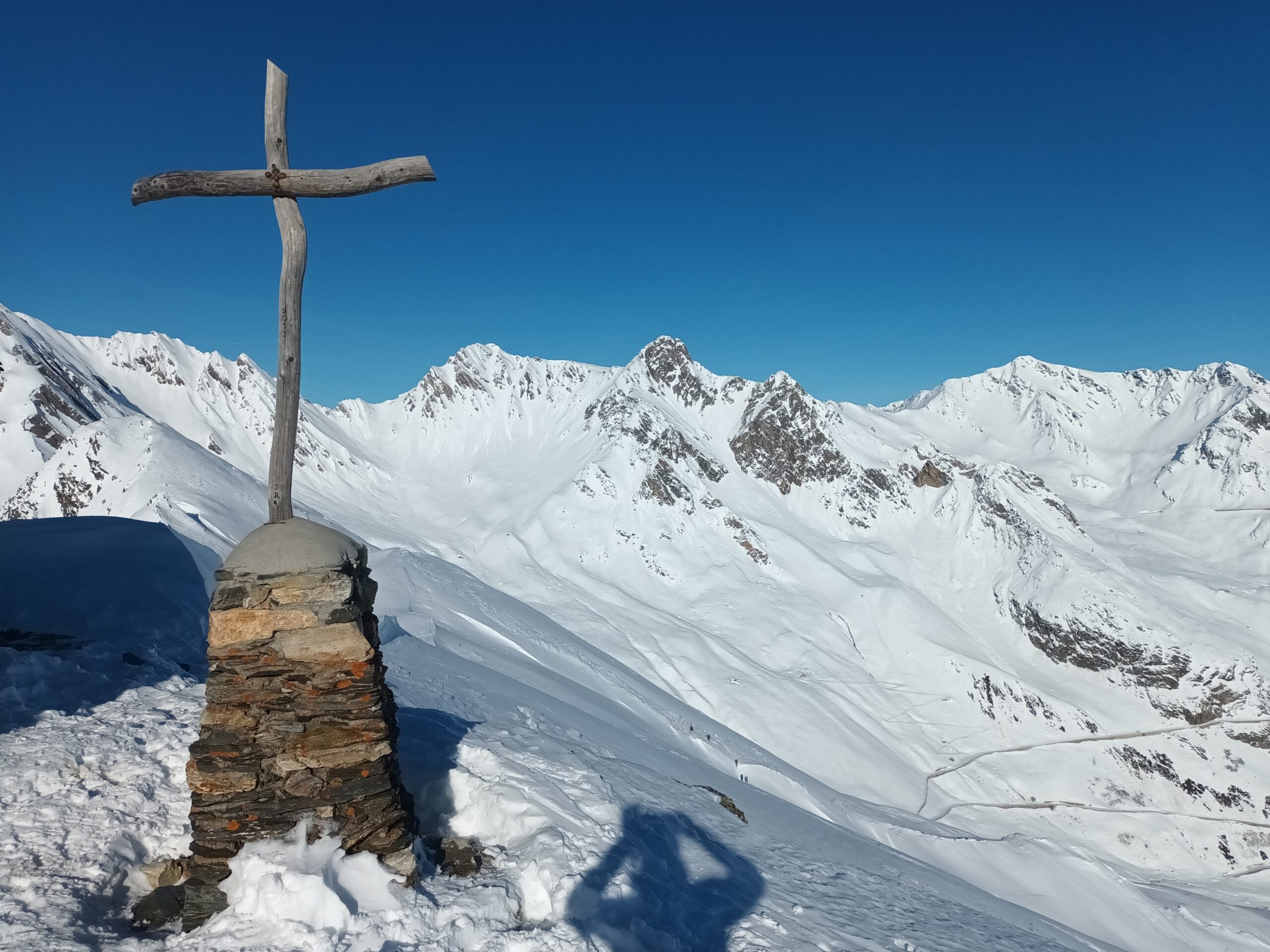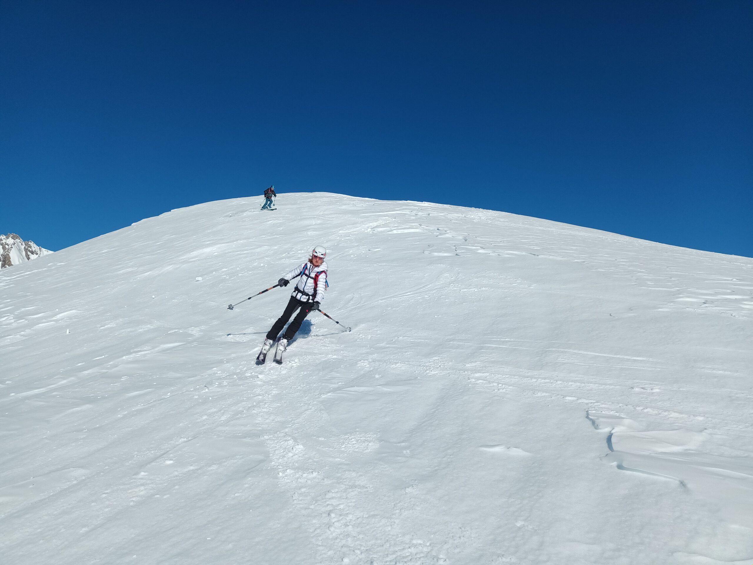 Giornata molto soleggiata e calda…anche troppo con lo zero termico segnalato a 3.300 metri! Abbiamo seguito il percorso più diretto arrivando direttamente al bivacco Deffeyes salendo i ripidi pendii rimasti in ombra solo nei primi 300 metri di dislivello. Poi si poteva salire in maglietta, come qualcuno ha fatto. Parecchio affollamento in vetta per questa gettonatissima classica della scialpinismo in Valle d’Aosta. Discesa sostanzialmente sullo stesso itinerario di salita con neve ancora farinosa fino a quota 2.200 circa e poi primaverile. Duri e un poco gelati soltanto gli ultimi 150/200 metri di dislivello rimasti all’ombra. Con gli amici di antica data Beppe & Daniela, Piero & Marilena, Roby & Ale.