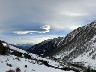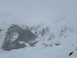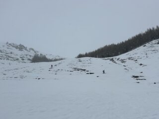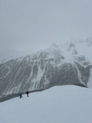 Partiti coi migliori presupposti: ritardo su un orario di partenza già tardo.. per fortuna che le condizioni meteo sono ottime: il nevischio previsto per le 13 arriva alle 9.30 migliorando significativamente la visibilità e la godibilità della gita assieme a quella piacevole “brezza” gelida (almeno questa era come da previsioni).. si prosegue a suon di imprecazioni e scivoloni sul ghiaccio, il tutto condito dal miglior clima natalizio e sereno, l’amicizia diventa più intensa e ci si insulta per testare le capacità di autocontrollo vicendevoli.. ormai contenti della bella salita, dell’ottimo panorama grigio, si decide di non tardare ulteriormente la discesa e si spella nel punto più esposto al vento, a 300mt di dislivello dall’arrivo… ok, tutta la (poca) neve scesa è stata eliminata dal vento.. discesa iniziale su ghiaccio da vento, infine ravanage su neve simil primaverile… a quel punto torna il sole…