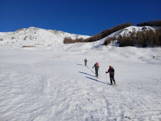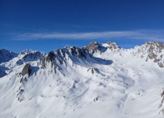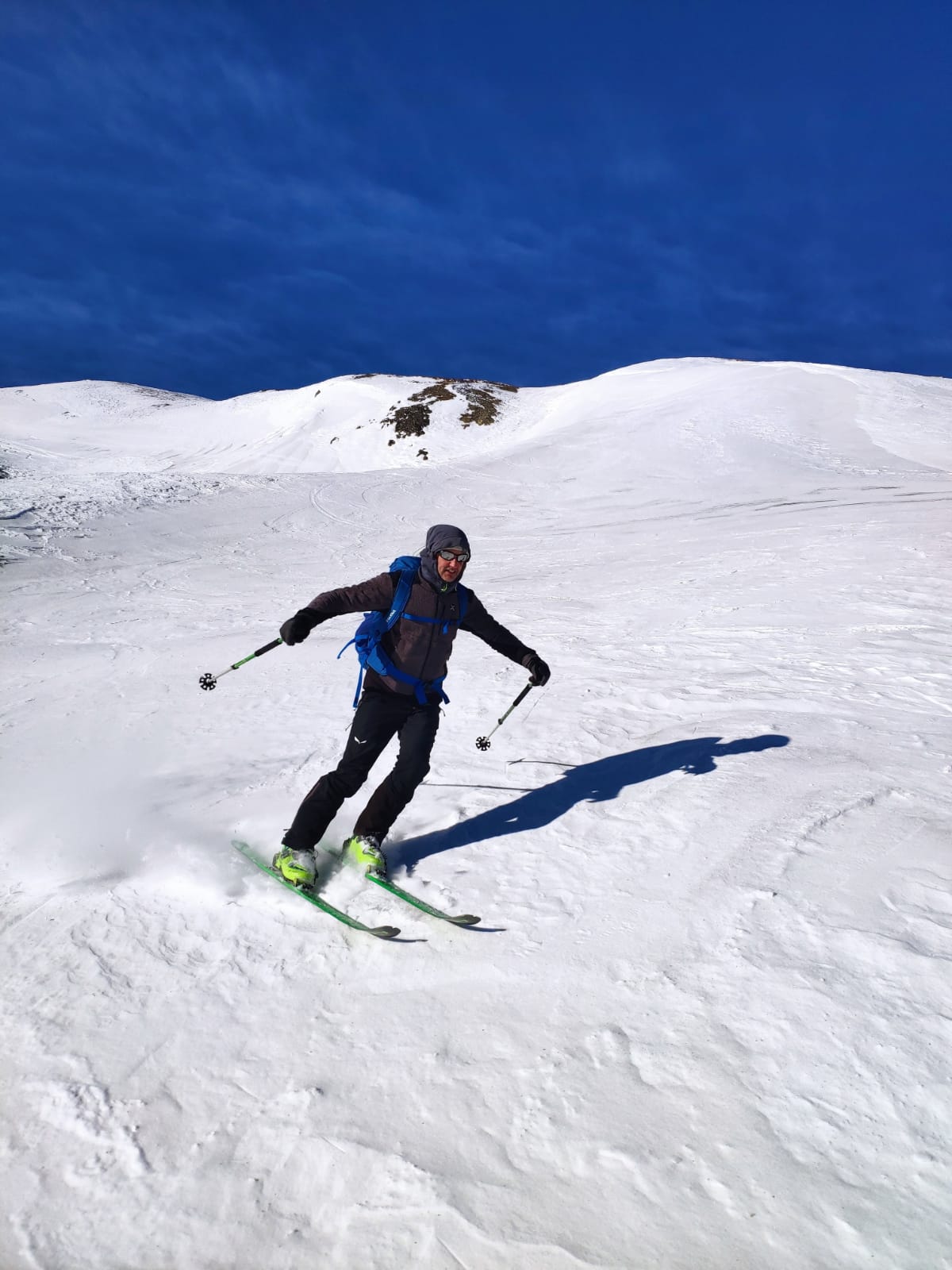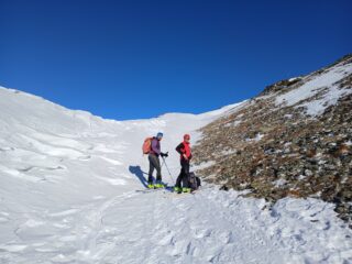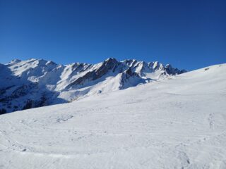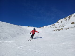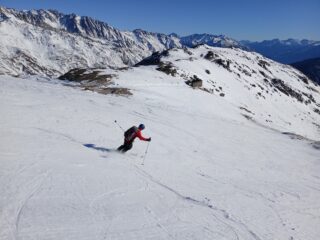 Condizioni di innevamento non ottimale, con il vento del giorno precedente che ha pelato molti pendii. Si parte comunque senza problemi dal piazzale di Crevacol su traccia continua e gelata in alcuni tratti. Vento freddo in vetta. Discesa di sopravvivenza nei primi 250 metri in fuoripista, con manto nevoso marmoreo e qualche pietra affiorante. Tutta un’altra storia una volta rientrati sulle piste del comprensorio, perfette e assolutamente non affollate. Con Luca e Matteo.