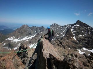 I primi torrioni sono quelli più impiegnativi, ma poco esposti; dove sono presenti gli unici chiodi della cresta. Nel complesso ci è piaciuta la continuità, anche se nell’ultimo pezzo di sfasciumi ci si annoia!!! Utili nuts nei primi 2 torrioni.in compagnia di dona e un camoscio…