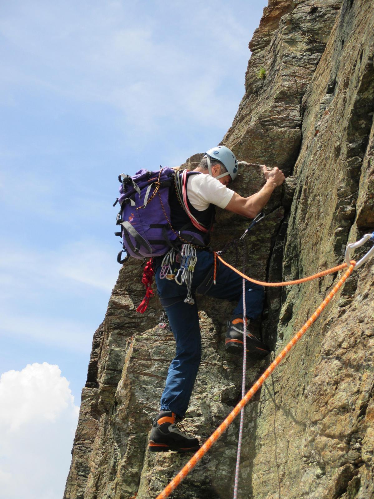 In automobile fino al rifugio Selleries. Sentiero ben segnato fino al colle dove parte la cresta. 1° tiro 4+ ma decisamente impegnativo come inizio e non facilmente proteggibile. 2° tiro molto bello in fessura e ben proteggibile. 2° torrione e 3° tiro diedro protetto a chiodi e possibilità di aggiungere friend e dadi. Dopo in conserva fino in cima alla punta Cristalliera. Discesa in sentiero fino a ritornare al rifugio Selleries.