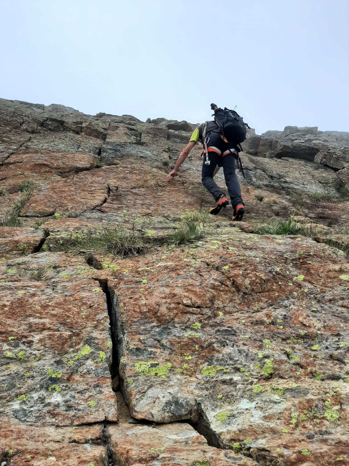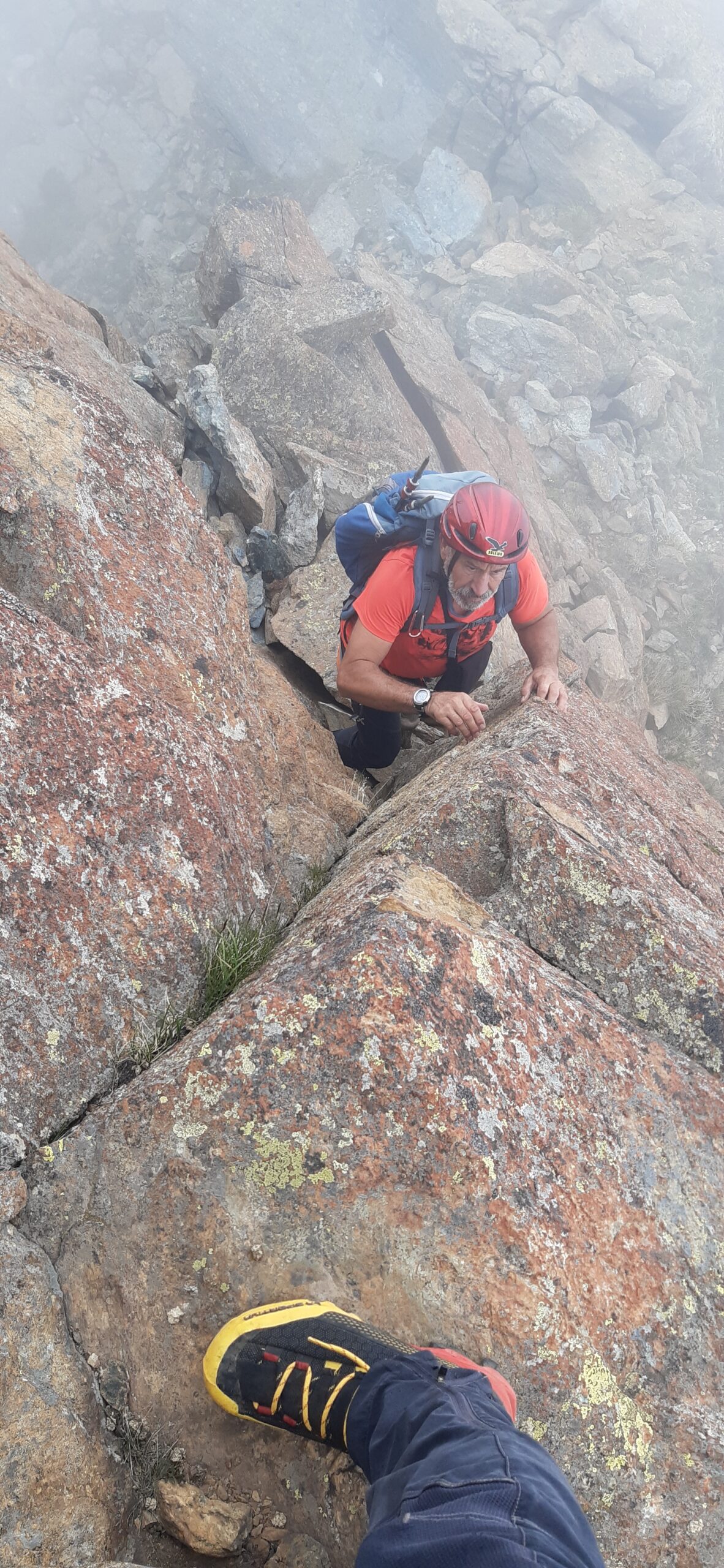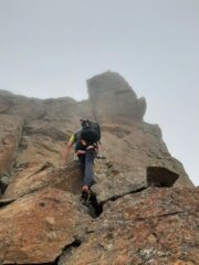 Buon sentiero segnato per il Colle di Pra Reale dal bivio sul sentiero per il Robinet. Aggirato il primo ostico torrione, perché in scarponi e non avevamo voglia di fate tiri di corda e calate varie. Così, slegati e liberi abbiamo arrampicato su bella roccia rugosa di colore ferruginoso fino in cima sul 2° e 3° grado max. Alcuni tratti esposti hanno richiesto attenzione ma sempre ben appigliati. Nebbie vaganti e pochi minuti di pioggia leggera in discesa in zona lago Manica. Con Gio.