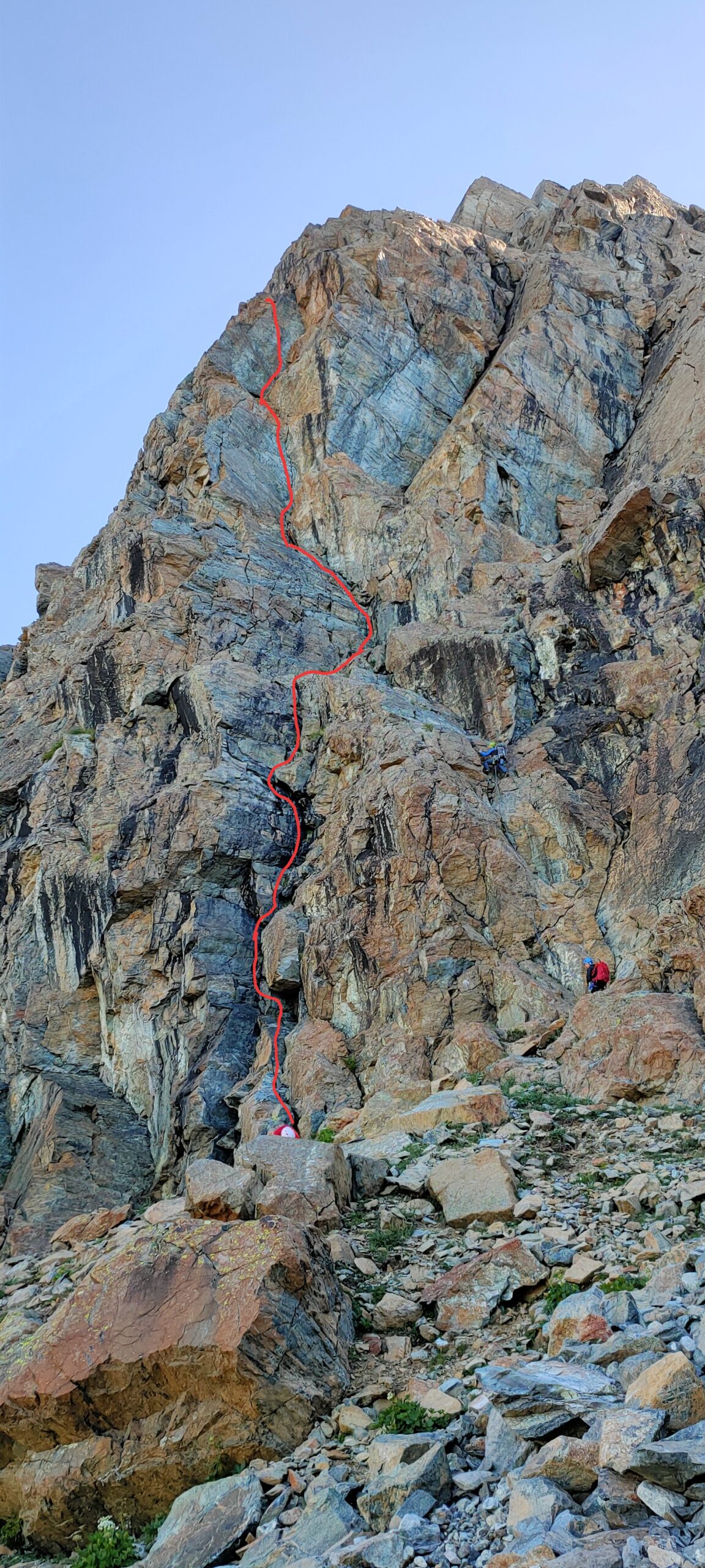 L1: Superare tutto il diedro sul fondo, evitando a sinistra uno strapiombo nerastro (IV tratto V-, un ch. in partenza e un cordone bianco), fino a comode terrazze alla base del diedro che si trova a destra dello spigolo e a sinistra del diedro Ghirardi. Salire i primi metri del diedro (IV+) fino alla sosta (2 ch. completamente inaffidabili e 2 nut) .