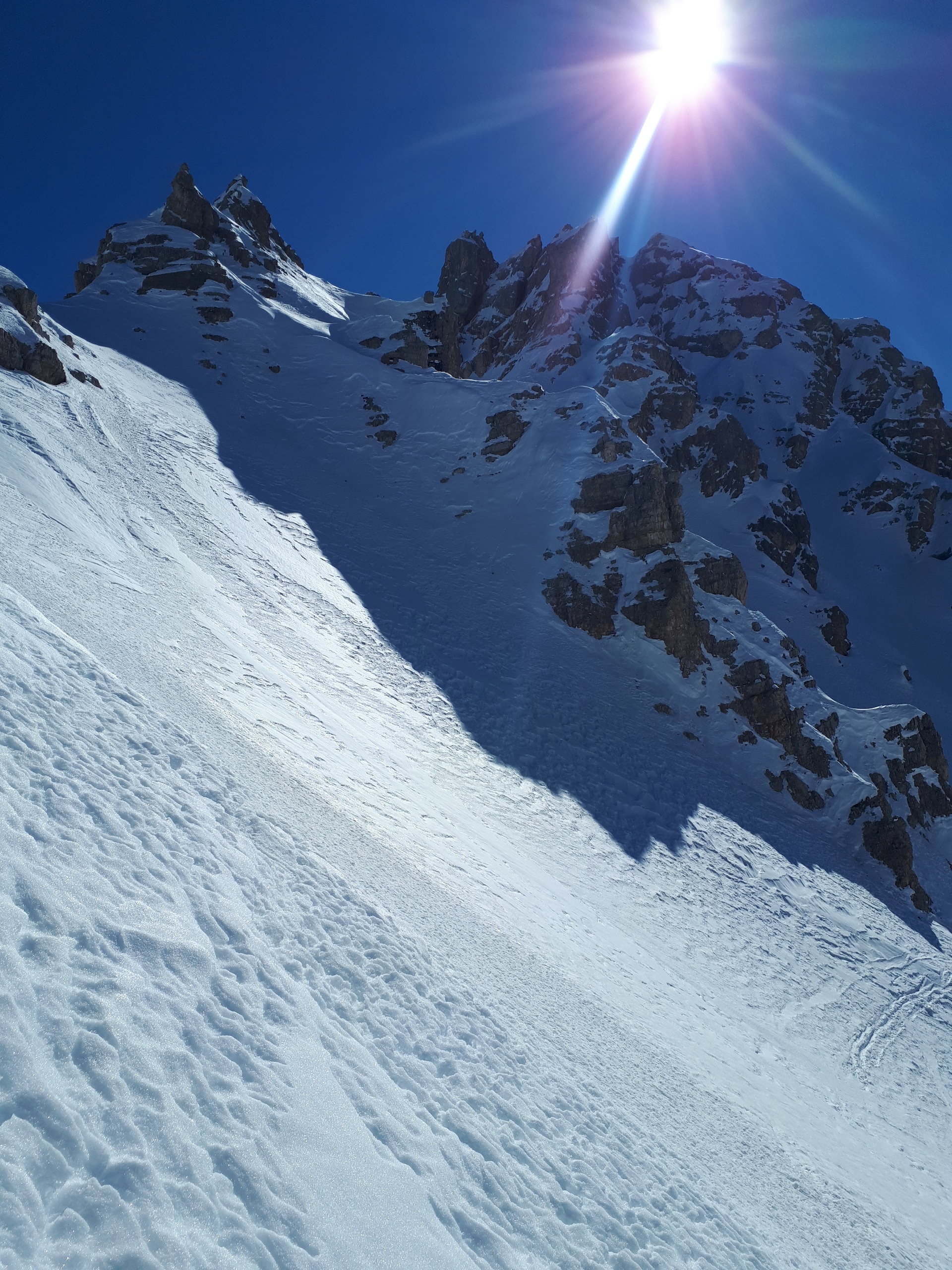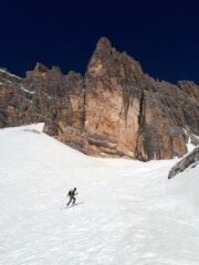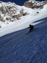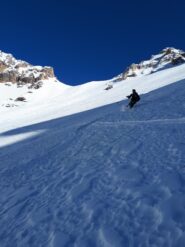 La pendenza aumenta costantemente fin sotto al Cristallino, ma sempre sci ai piedi. Una volta entrati nel canale, è meglio prima o poi, salire a piedi. La pendenza del canale è di circa 35°/40°, e quindi valutare se usare i ramponi a seconda delle condizioni. Il canale è esposto a sud, e nelle ore centrali, può diventare un forno.