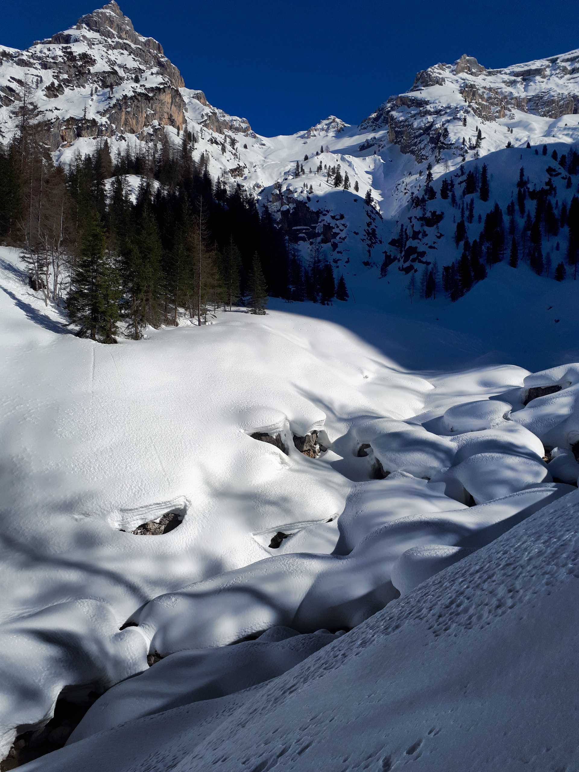 Da qui ci si affaccia nella nascosta Valle del Forame, di solito non molto percorsa. La discesa all’inizio è per ampi pendii esposti a NO. Poi la valle si stringe e bisogna tenere la sinistra orografica, finendo per balzi nevosi, a tratti un pò ripidi e, tenendosi lontani dal canyon centrale, raggiungere il torrente pianeggiante, sempre alla sua sinistra.
