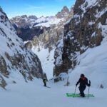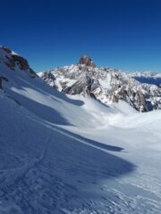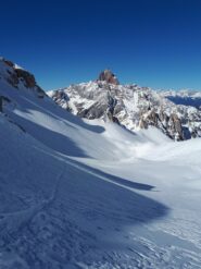 Arrivati al colle di Forcella Grande 2845m, sul lato opposto si aprirà un ampio catino nevoso racchiuso tra la Cresta Bianca a sinistra e la Cresta di Costabella a destra.